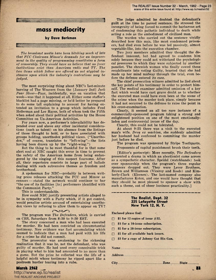 MARCH 1962 CONTENTS: Page 01: SHOULD VIOLENCE BE MET WITH VIOLENCE? by John C. Lowry, The Story Behind The Rumor About President Kennedy's First Marriage..., and IS THERE SEX LIFE IN OUTER SPACE? by Bob Abel -- Page 02: EDITORIAL TYPE STUFF -- Page 03 -- Page 04 -- Page 05 -- Page 06 -- Page 07 -- Page 08 -- Page 09 -- Page 10: MODEST PROPOSALS by John Francis Putnam and A VISIT FROM THE F.B.I. by William Worthy -- Page 11 -- Page 12 -- Page 13: DOUBLE ENTENDRE OF THE MONTH -- Page 14: NO WAR TODAY by Michael Valenti -- Page 15: The TREND IS TOWARD DIRTY by Peter Edler -- Page 16: The AUTOMOBILE AS A VEHICLE OF DEMOCRACY by T. D. C. Kuch -- Page 17: THE REALIST READER SURVEY -- Page 18 -- Page 19 -- Page 20 -- Page 21 -- Page 22 -- Page 23: MASS MEDIOCRITY by Dave Berkman -- Back Cover: QUOTED WITHOUT COMMENT ...