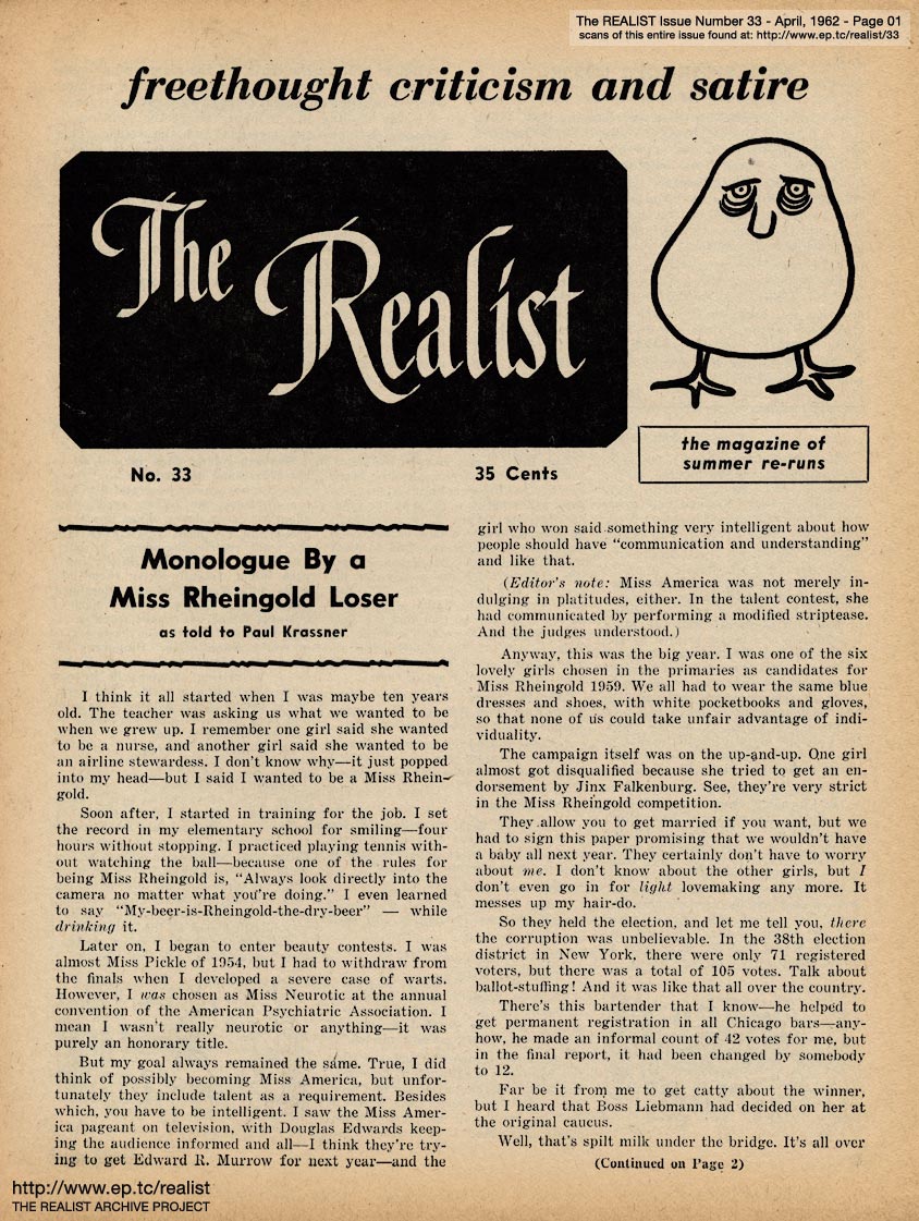 "A great many readers have asked that we reprint the highlights of our unavailable back issues. In response to those requests—also, to give me a chance to recuperate from a slight case of overwork, complicated by severe inefficiency; and to satisfy the post office's requirement that the Realist maintain its stated frequency of publication—we're publishing two 16-page issues (#33 and #34: April and May) during the first two weeks of July." |