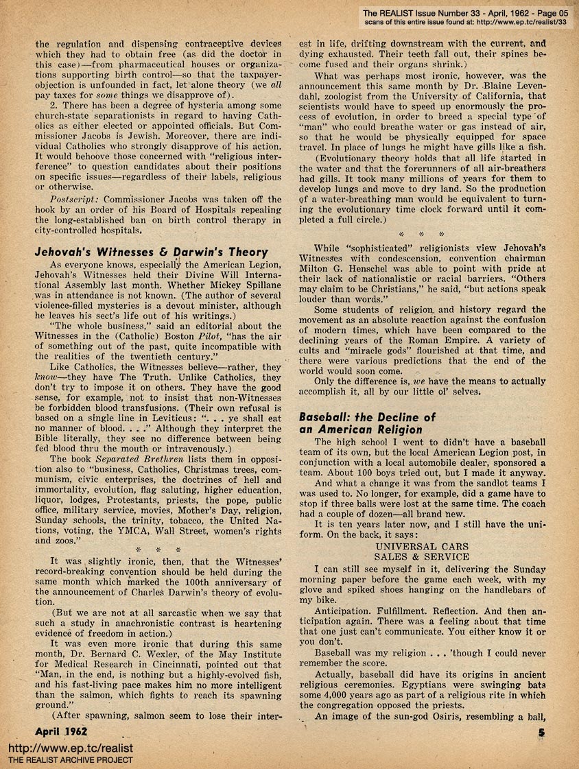 "A great many readers have asked that we reprint the highlights of our unavailable back issues. In response to those requests—also, to give me a chance to recuperate from a slight case of overwork, complicated by severe inefficiency; and to satisfy the post office's requirement that the Realist maintain its stated frequency of publication—we're publishing two 16-page issues (#33 and #34: April and May) during the first two weeks of July." |