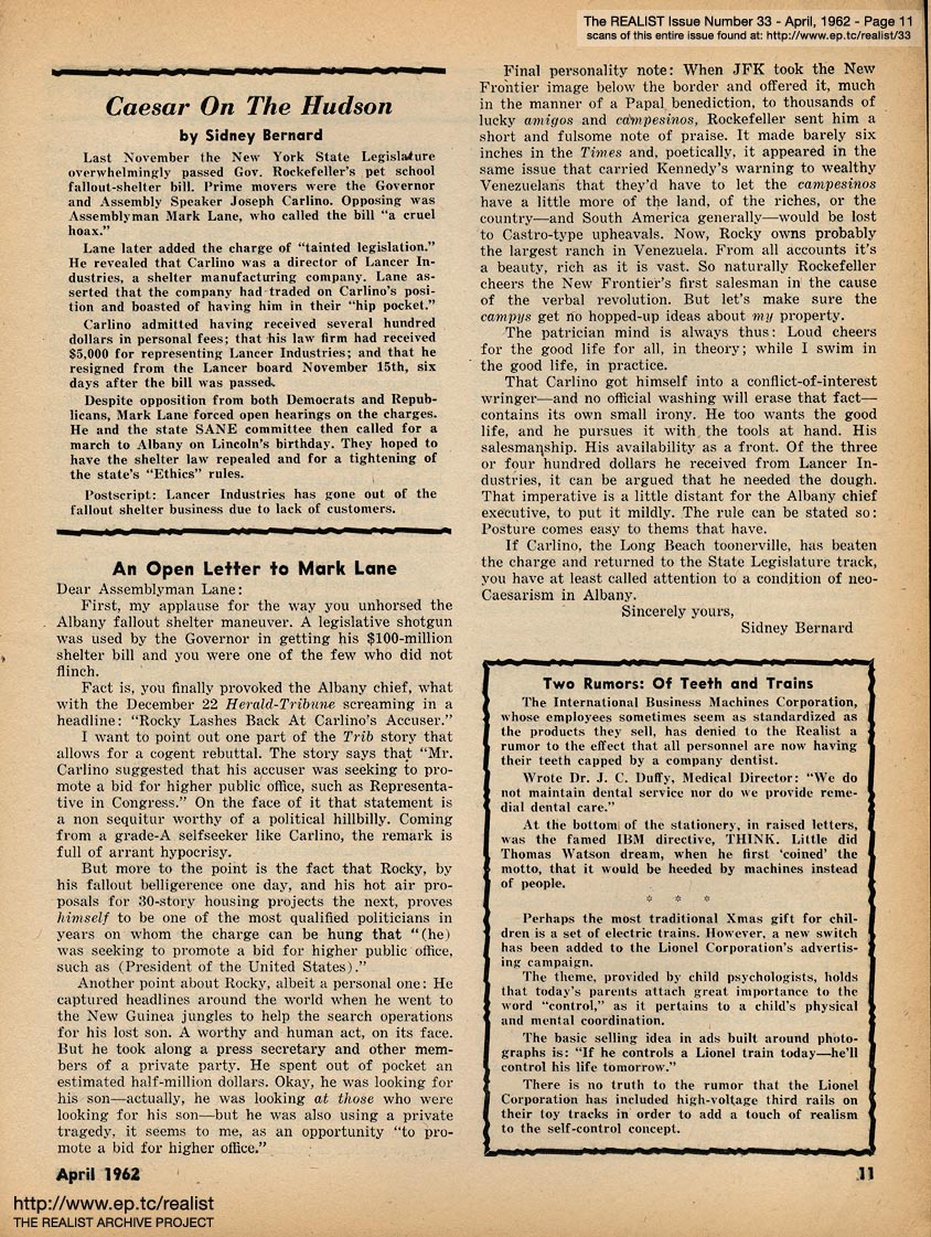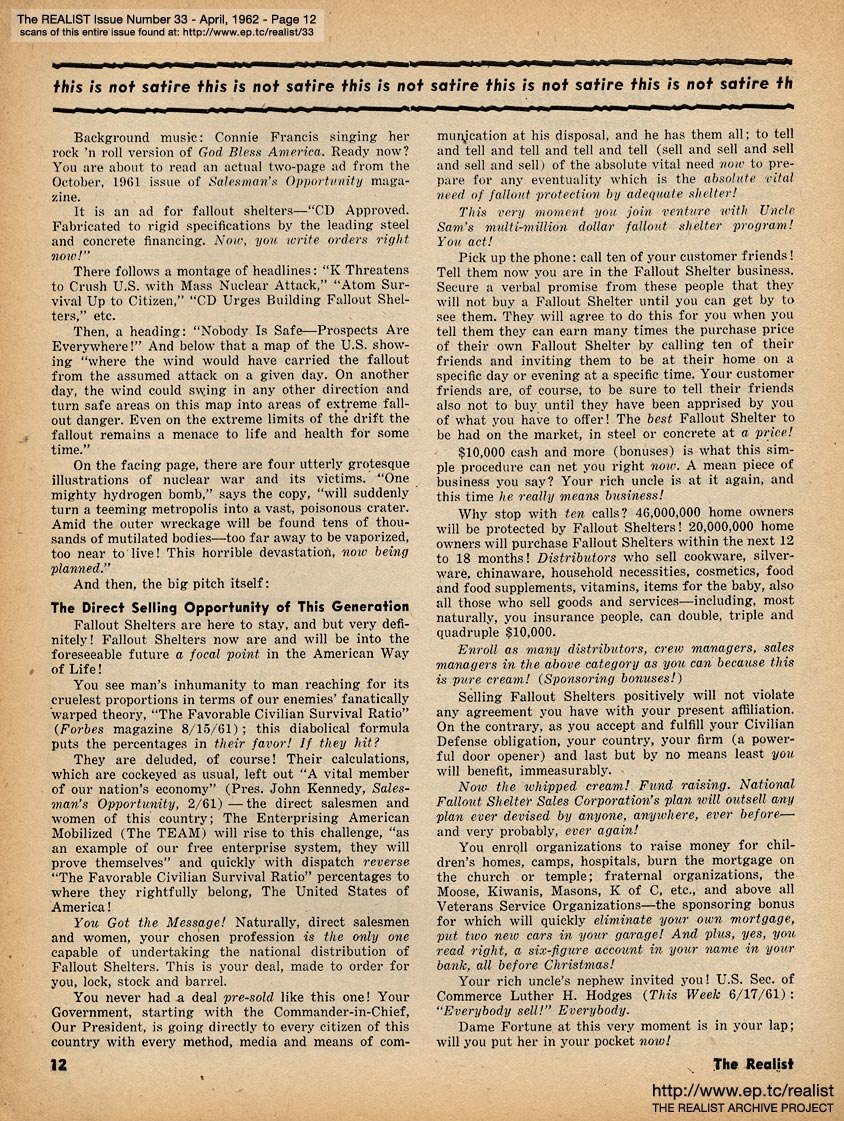 "A great many readers have asked that we reprint the highlights of our unavailable back issues. In response to those requests—also, to give me a chance to recuperate from a slight case of overwork, complicated by severe inefficiency; and to satisfy the post office's requirement that the Realist maintain its stated frequency of publication—we're publishing two 16-page issues (#33 and #34: April and May) during the first two weeks of July." |