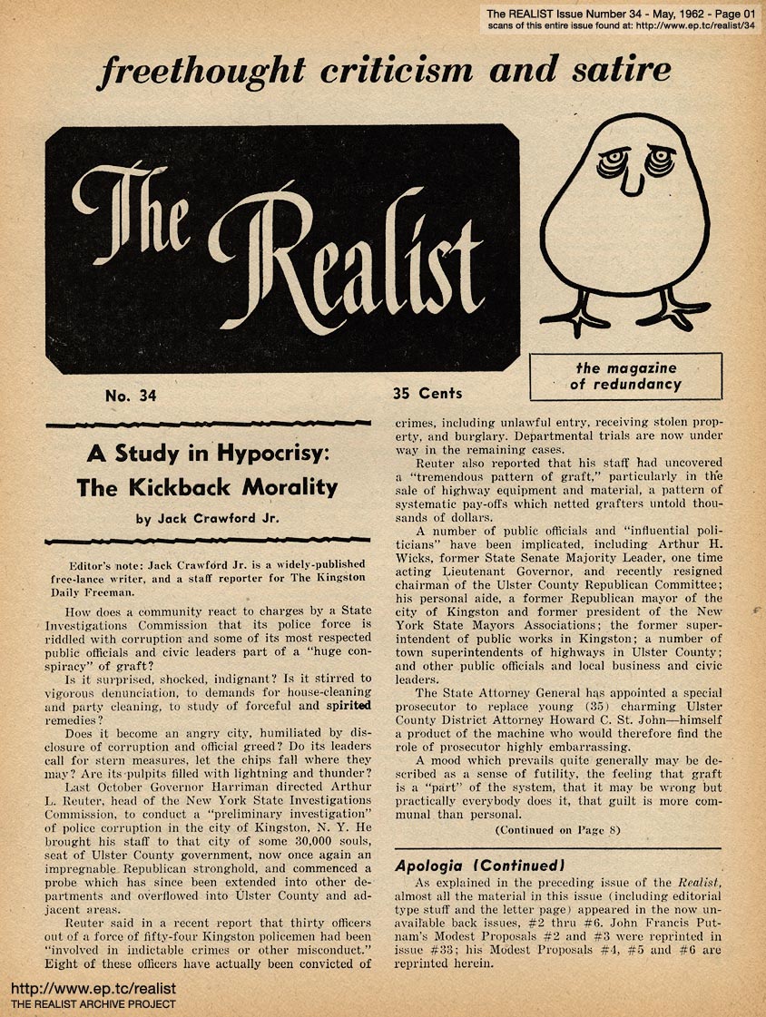 "A great many readers have asked that we reprint the highlights of our unavailable back issues. In response to those requests—also, to give me a chance to recuperate from a slight case of overwork, complicated by severe inefficiency; and to satisfy the post office's requirement that the Realist maintain its stated frequency of publication—we're publishing two 16-page issues (#33 and #34: April and May) during the first two weeks of July." |