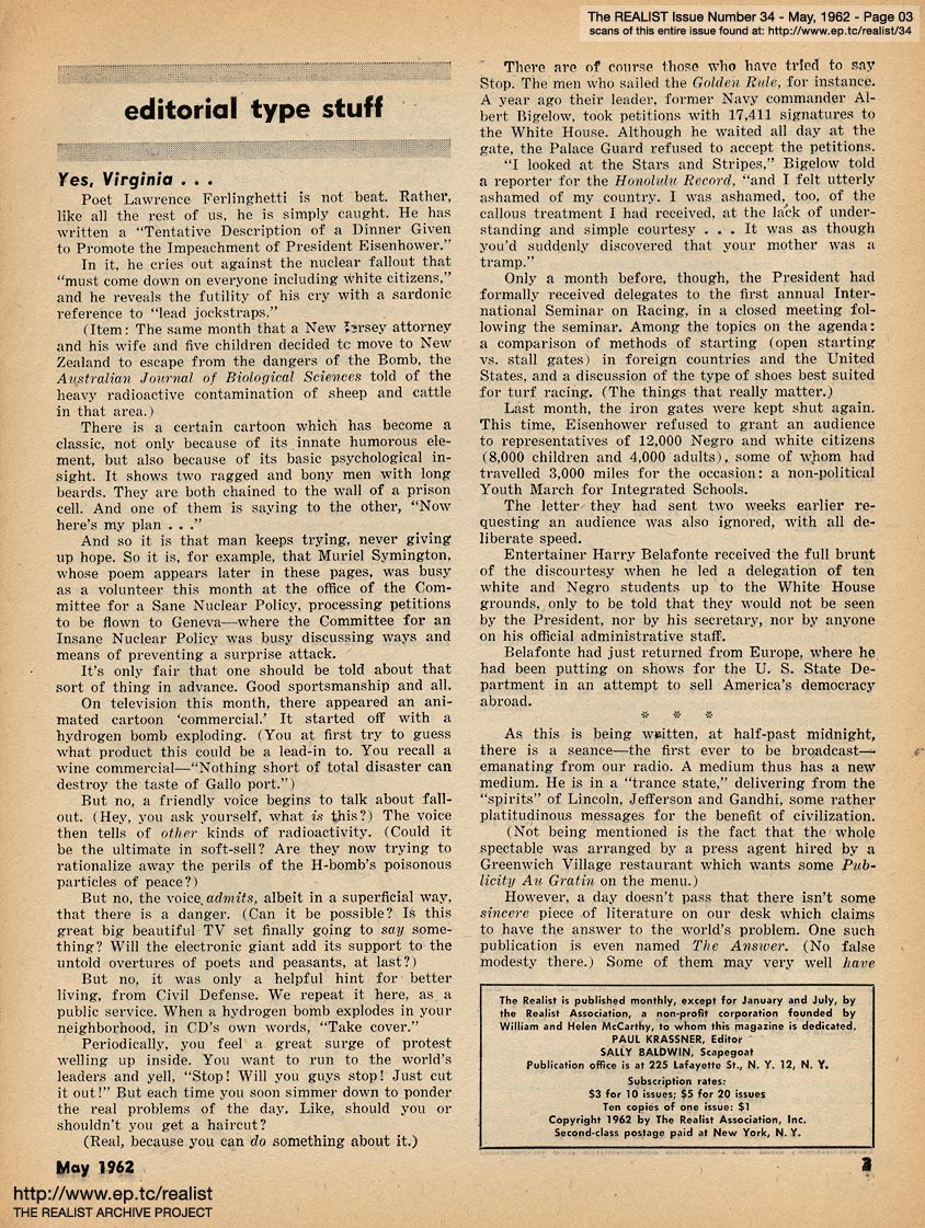"A great many readers have asked that we reprint the highlights of our unavailable back issues. In response to those requests—also, to give me a chance to recuperate from a slight case of overwork, complicated by severe inefficiency; and to satisfy the post office's requirement that the Realist maintain its stated frequency of publication—we're publishing two 16-page issues (#33 and #34: April and May) during the first two weeks of July." |