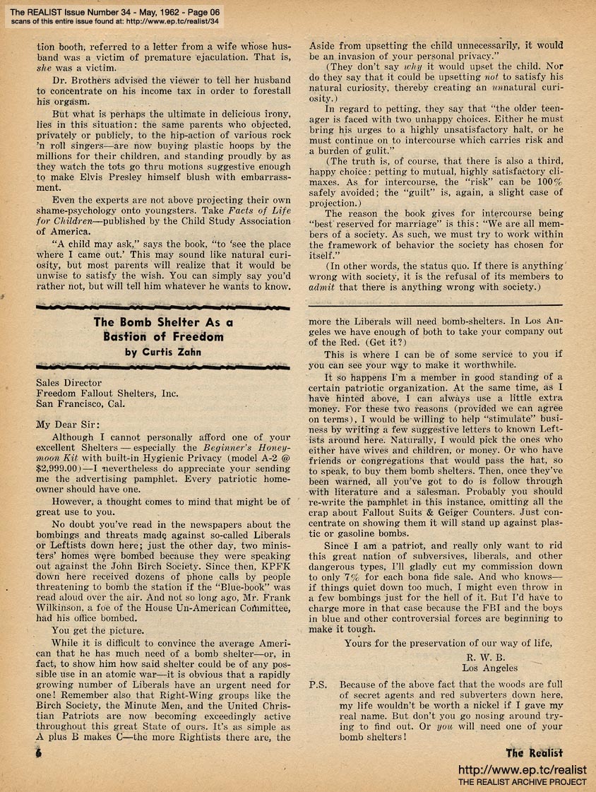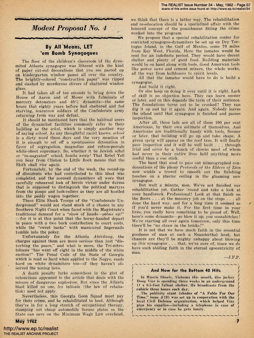 "A great many readers have asked that we reprint the highlights of our unavailable back issues. In response to those requests—also, to give me a chance to recuperate from a slight case of overwork, complicated by severe inefficiency; and to satisfy the post office's requirement that the Realist maintain its stated frequency of publication—we're publishing two 16-page issues (#33 and #34: April and May) during the first two weeks of July." |