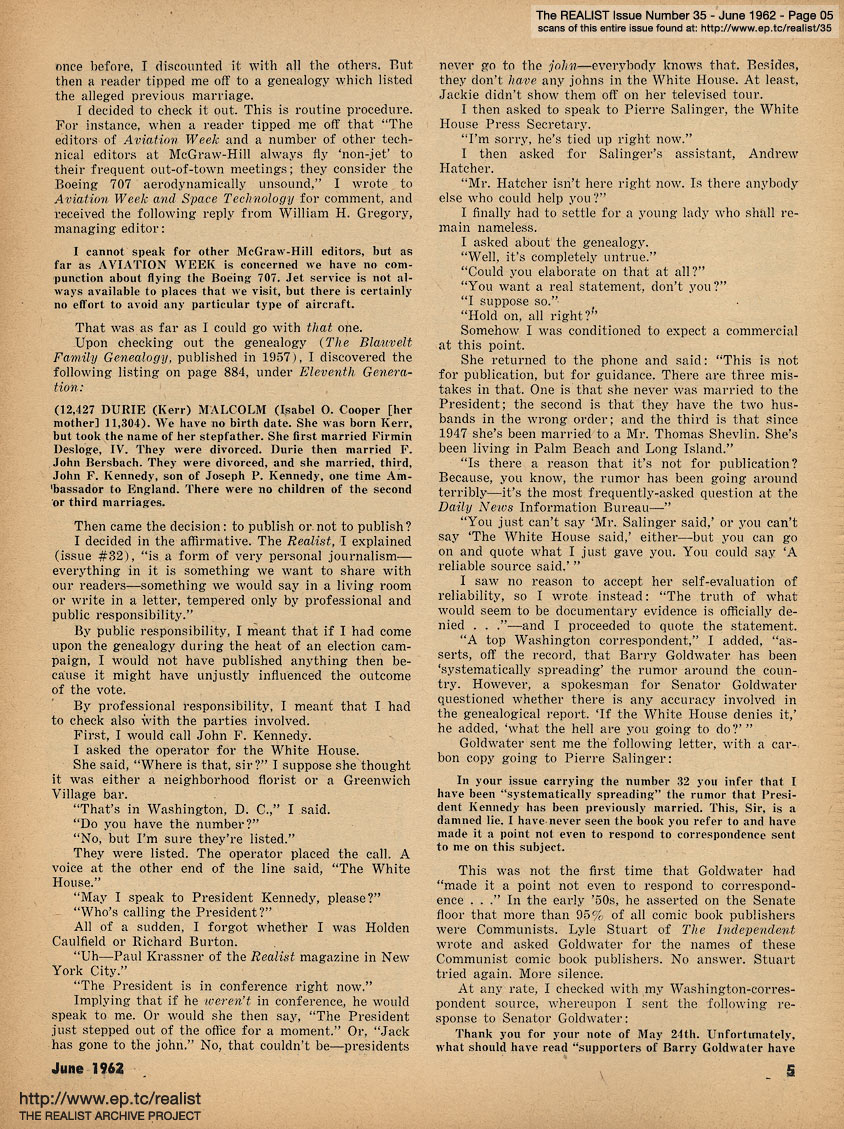 JUNE 1962 CONTENTS: Page 01: "Beginning our fifth year of publication ... Special Offensive issue" -- Page 02: EDITORIAL TYPE STUFF - ... and God Bless the Supreme Court - I Like Eich (Continued) - Scared to Death? -- Page 03: Tropic of Schizophrenia - Of Pigs and Prudes -- Page 04: You Gotta Hit 'Em Where It Hurts - Case History of the Kennedy Caper -- Page 05 -- Page 06: Ah Sordid Announcements - A Matter of Taste -- Page 07: A Navel Travels On Its Reputation - An Army Travels On Its Armpits -- Page 08: THE ANNIVERSARY TWIST and REALMATE OF THE MONTH -- Page 09: WHAT PRICE FREE ENTERPRISE? some reflections by Dave Berkman on John Henry Faulk, who's $3,500,000 richer but still not back on radio - and - a blackout sketch by James E. Butler from Digging For Apples, which opens in August at the Wash. Sq. Theatre - and MODEST PROPOSALS by John Francis Putnam (introduction) -- Page 10: MODEST PROPOSALS COLORING BOOKS - Black Muslims Kill All the White Muthafukkas - Wop - Jap Atrocities Against American Army Nurses! - The Sexy Catholic Nuns in Black Lace Underwear - The Braille Coloring Book - George Lincoln Rockwell's Jew Bastard - Auschwitz Cooking and Coloring Book - The Spastic - and The Police Kicking Shit Out of Non-Violent Ban the Bomb Demonstrators -- Page 11: THE IRRESPONSIBILITIES OF THE MASS MEDIA by William Worthy -- Page 12 -- Page 13: RUMOR OF THE MONTH - DEPT OF SATIRICAL POTENTIAL and CALORIES DON'T COUNT, BUT QUAKERS DO -- Page 14: AN IMPOLITE INTERVIEW WITH AN ABORTIONIST -- Page 15 -- Page 16 -- Page 17: "Good Grief Charlie Brown!" (Pregnant Lucy) -- Page 18: J.C. by Ken Seagel and bhob stewart -- Page 19: WHAT COLUMNIST DO YOU READ? - ODE TO PROGRESS - WHICH AX DO YOU GRIND? -- Page 20 -- Page 21: TWO WOMEN IN SEARCH OF EMPLOYMENT by Sylvia E. Anderson and Madalyn E. Murray -- Page 22: U.S. SEEKS CHANGE IN FARMER IMAGE -- Page 23: INSIDE TRUE STORY and MIDWEST SIDE STORY -- Page 24 -- Page 25 -- Page 26: WHAT PEOPLE ARE TALKING ABOUT THAT VOGUE WON'T ADMIT TO ... and BUT ENJOYING IT LESS? -- Page 27: A REALIST GAME - WHO WOULD YOU KICK OUT OF BED? by Sally Baldwin -- Page 28: THE GREAT HOTEL ROBBERY by Lenny Bruce and WISHFUL THOUGHT by Charles M. Olin -- Page 29: HOW SOME INTELLIGENT PEOPLE CAN BECOME EFFECTIVE by George von Hilsheimer -- Page 30 -- Page 31 -- Back Cover: EXCERPT FROM "AN AFTERNOON WITH A SELF-STYLED PHONY"