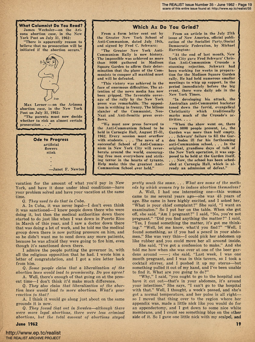 You are reading Issue No. 35 - Featuring Modest Proposal's Realist Coloring Books and An Impolite Interview with an Abortionist - June, 1962
