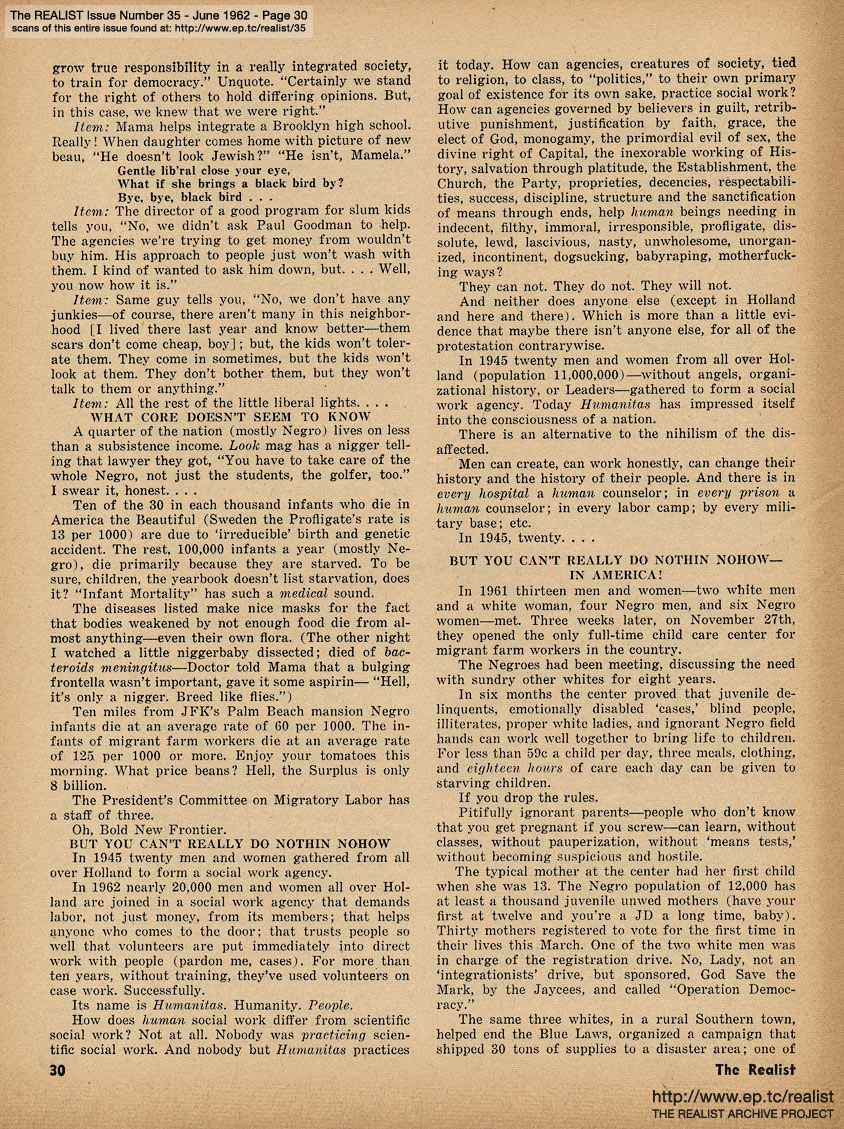 JUNE 1962 CONTENTS: Page 01: "Beginning our fifth year of publication ... Special Offensive issue" -- Page 02: EDITORIAL TYPE STUFF - ... and God Bless the Supreme Court - I Like Eich (Continued) - Scared to Death? -- Page 03: Tropic of Schizophrenia - Of Pigs and Prudes -- Page 04: You Gotta Hit 'Em Where It Hurts - Case History of the Kennedy Caper -- Page 05 -- Page 06: Ah Sordid Announcements - A Matter of Taste -- Page 07: A Navel Travels On Its Reputation - An Army Travels On Its Armpits -- Page 08: THE ANNIVERSARY TWIST and REALMATE OF THE MONTH -- Page 09: WHAT PRICE FREE ENTERPRISE? some reflections by Dave Berkman on John Henry Faulk, who's $3,500,000 richer but still not back on radio - and - a blackout sketch by James E. Butler from Digging For Apples, which opens in August at the Wash. Sq. Theatre - and MODEST PROPOSALS by John Francis Putnam (introduction) -- Page 10: MODEST PROPOSALS COLORING BOOKS - Black Muslims Kill All the White Muthafukkas - Wop - Jap Atrocities Against American Army Nurses! - The Sexy Catholic Nuns in Black Lace Underwear - The Braille Coloring Book - George Lincoln Rockwell's Jew Bastard - Auschwitz Cooking and Coloring Book - The Spastic - and The Police Kicking Shit Out of Non-Violent Ban the Bomb Demonstrators -- Page 11: THE IRRESPONSIBILITIES OF THE MASS MEDIA by William Worthy -- Page 12 -- Page 13: RUMOR OF THE MONTH - DEPT OF SATIRICAL POTENTIAL and CALORIES DON'T COUNT, BUT QUAKERS DO -- Page 14: AN IMPOLITE INTERVIEW WITH AN ABORTIONIST -- Page 15 -- Page 16 -- Page 17: "Good Grief Charlie Brown!" (Pregnant Lucy) -- Page 18: J.C. by Ken Seagel and bhob stewart -- Page 19: WHAT COLUMNIST DO YOU READ? - ODE TO PROGRESS - WHICH AX DO YOU GRIND? -- Page 20 -- Page 21: TWO WOMEN IN SEARCH OF EMPLOYMENT by Sylvia E. Anderson and Madalyn E. Murray -- Page 22: U.S. SEEKS CHANGE IN FARMER IMAGE -- Page 23: INSIDE TRUE STORY and MIDWEST SIDE STORY -- Page 24 -- Page 25 -- Page 26: WHAT PEOPLE ARE TALKING ABOUT THAT VOGUE WON'T ADMIT TO ... and BUT ENJOYING IT LESS? -- Page 27: A REALIST GAME - WHO WOULD YOU KICK OUT OF BED? by Sally Baldwin -- Page 28: THE GREAT HOTEL ROBBERY by Lenny Bruce and WISHFUL THOUGHT by Charles M. Olin -- Page 29: HOW SOME INTELLIGENT PEOPLE CAN BECOME EFFECTIVE by George von Hilsheimer -- Page 30 -- Page 31 -- Back Cover: EXCERPT FROM "AN AFTERNOON WITH A SELF-STYLED PHONY"