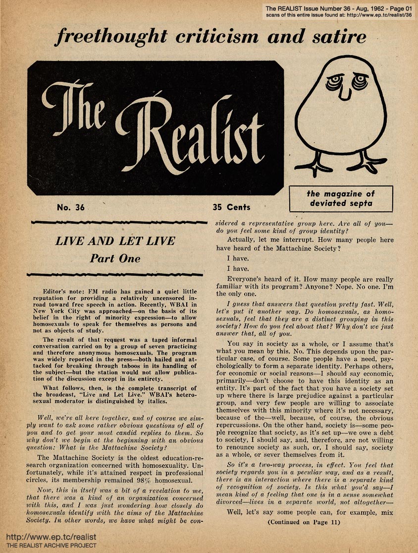 AUGUST 1962 CONTENTS: Page 01: LIVE AND LET LIVE Part One (of Three) -- Page 02: EDITORIAL TYPE STUFF -- Page 03: CHASTITY AND FREEDOM by Roger W. Wescott, with TALES TOLD BY A SOCIOLOGY BOOK by Susan Williams -- Page 04 -- Page 05: "THE PILL" (part one of three) -- Page 06 -- Page 07 -- Page 08 and 09: THE STRIPPER (Centerfold) by Mike Thaler -- Page 10: MOVIE REVIEWS OF MOVIES THAT NEVER GET REVIEWED by Chuck Alverson and by Bob Reisner -- Page 11 -- Page 12 -- Page 13: O'BRIAN HAS DOUBTS ABOUT HOMOSEXUALITY -- Page 14 -- Page 15 -- Back Cover: REPORT FROM AN INDEPENDENT RESEARCH LABORATORY