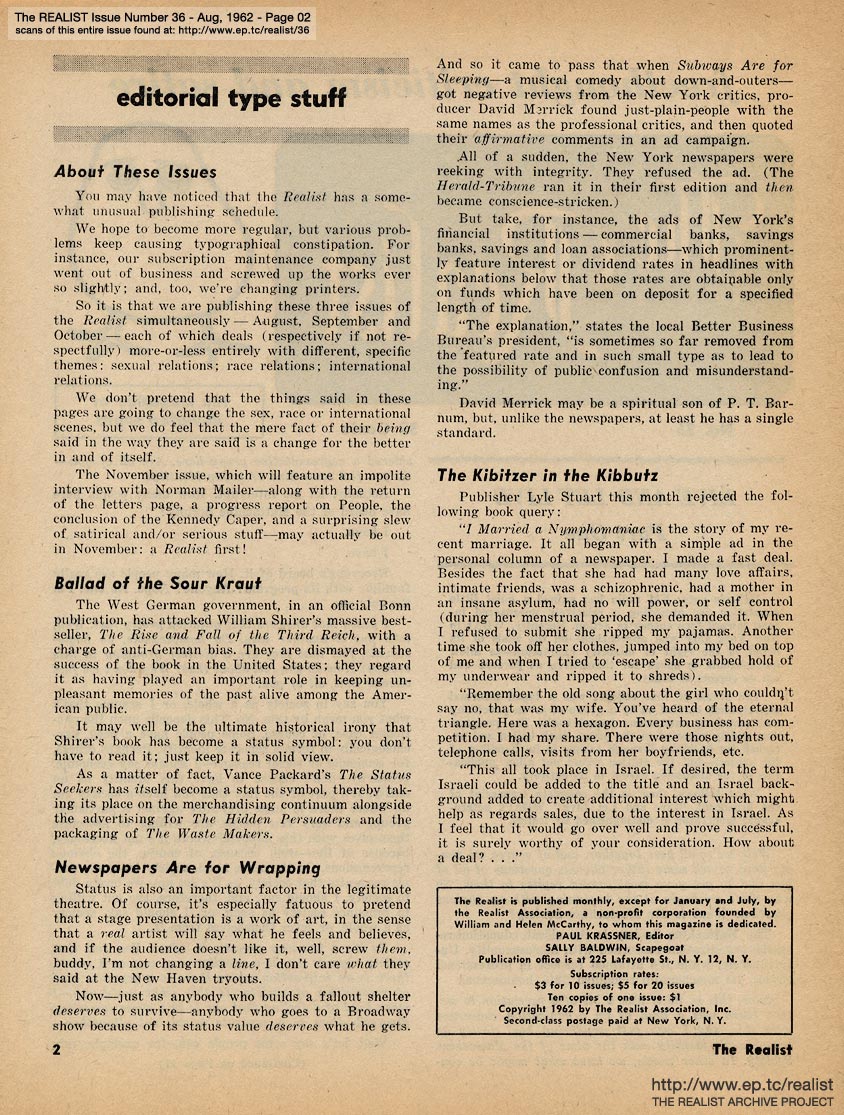 QUOTE FROM PAGE TWO: You may have noticed that the Realist has a somewhat unusual publishing schedule ... [subsequently] we are publishing these three issues of the Realist simultaneously -- August, September and October. Each deals with different, specific themes. CHOOSE: