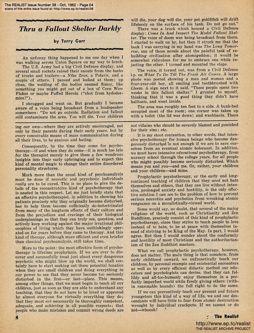 OCTOBER 1962 CONTENTS: Page 01: PSYCHOTHERAPY AND ATOMIC WARFARE by Albert Ellis, Ph.D. -- Page 02: EDITORIAL TYPE STUFF - In Praise of Tabloidsville and Hamminess, Inc. -- Page 03 -- Page 04 -- THRU A FALLOUT SHELTER DARKLY by Terry Carr -- Page 05: AN IMPOLITE INTERVIEW WITH DANNY DAVIS (with About the Interviewee) -- Page 06 -- Page 07 -- Page 08: May This House Be Safe From Pansies with LIVE AND LET LIVE Part Three (of Three) -- Page 09 -- Page 10 -- Page 11 -- Page 12 -- Page 13 -- Page 14: "THE PILL" Part Three (of Three) -- Page 15 -- Back Cover: (Illos: Repeat Ye Sinners)
