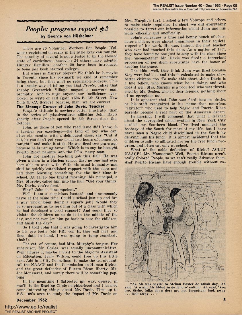 JUNE 1965 CONTENTS: Page 01: AN IMPOLITE INTERVIEW WITH NORMAN MAILER -- Page 02: SIR REALIST -- Page 03: EDITORIAL TYPE STUFF -- Page 04: DEPARTMENT OF PERSONAL PROPAGANDA -- Page 05: PEOPLE PROGRESS REPORT #2 by George von Hilsheimer -- Page 06 -- Page 07 -- Page 08: MODEST PROPOSALS by John Francis Putnam -- Page 09 -- Page 10 -- Page 11: THE MORAL AND THE TACTICAL by William Worthy -- Page 12 -- Page 13 -- Page 14 -- Page 15 -- Page 16 -- Page 17: "So You're Against Testing" (comic strip by Lou Myers) -- Page 18 -- Page 19 -- Page 20 -- Page 21: Love Song by Jonathon Ballard North -- Page 22 -- Page 23 -- Page 24: TWO CAN PLAY THE SAME GAME by Saul Heller