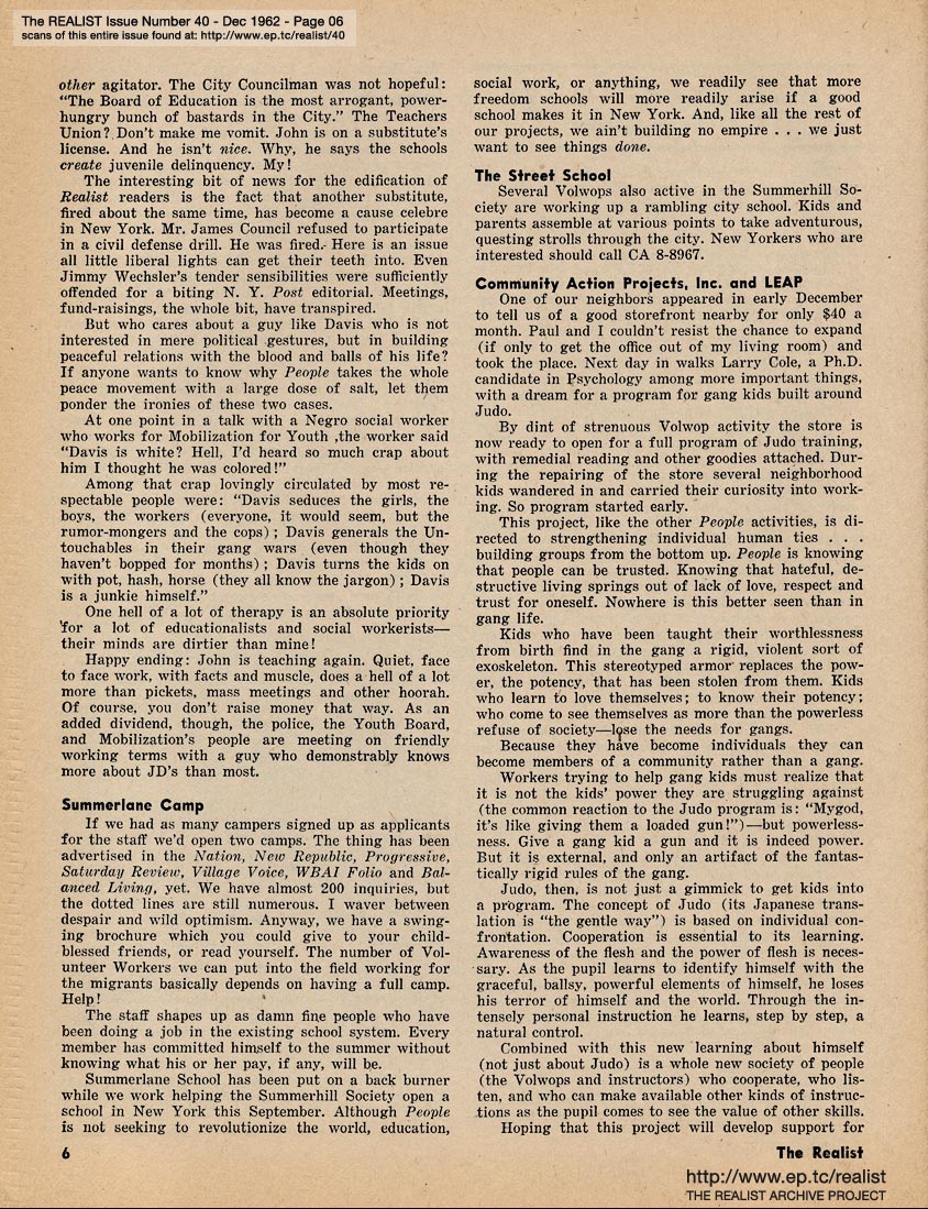 JUNE 1965 CONTENTS: Page 01: AN IMPOLITE INTERVIEW WITH NORMAN MAILER -- Page 02: SIR REALIST -- Page 03: EDITORIAL TYPE STUFF -- Page 04: DEPARTMENT OF PERSONAL PROPAGANDA -- Page 05: PEOPLE PROGRESS REPORT #2 by George von Hilsheimer -- Page 06 -- Page 07 -- Page 08: MODEST PROPOSALS by John Francis Putnam -- Page 09 -- Page 10 -- Page 11: THE MORAL AND THE TACTICAL by William Worthy -- Page 12 -- Page 13 -- Page 14 -- Page 15 -- Page 16 -- Page 17: "So You're Against Testing" (comic strip by Lou Myers) -- Page 18 -- Page 19 -- Page 20 -- Page 21: Love Song by Jonathon Ballard North -- Page 22 -- Page 23 -- Page 24: TWO CAN PLAY THE SAME GAME by Saul Heller