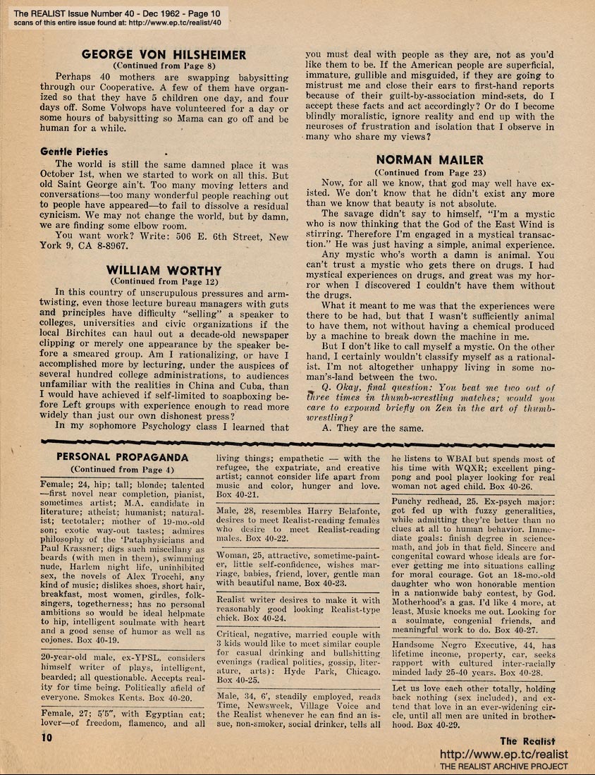 JUNE 1965 CONTENTS: Page 01: AN IMPOLITE INTERVIEW WITH NORMAN MAILER -- Page 02: SIR REALIST -- Page 03: EDITORIAL TYPE STUFF -- Page 04: DEPARTMENT OF PERSONAL PROPAGANDA -- Page 05: PEOPLE PROGRESS REPORT #2 by George von Hilsheimer -- Page 06 -- Page 07 -- Page 08: MODEST PROPOSALS by John Francis Putnam -- Page 09 -- Page 10 -- Page 11: THE MORAL AND THE TACTICAL by William Worthy -- Page 12 -- Page 13 -- Page 14 -- Page 15 -- Page 16 -- Page 17: "So You're Against Testing" (comic strip by Lou Myers) -- Page 18 -- Page 19 -- Page 20 -- Page 21: Love Song by Jonathon Ballard North -- Page 22 -- Page 23 -- Page 24: TWO CAN PLAY THE SAME GAME by Saul Heller