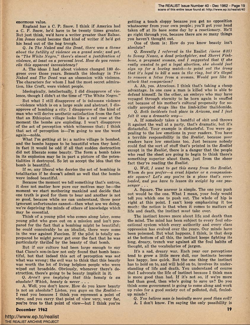 JUNE 1965 CONTENTS: Page 01: AN IMPOLITE INTERVIEW WITH NORMAN MAILER -- Page 02: SIR REALIST -- Page 03: EDITORIAL TYPE STUFF -- Page 04: DEPARTMENT OF PERSONAL PROPAGANDA -- Page 05: PEOPLE PROGRESS REPORT #2 by George von Hilsheimer -- Page 06 -- Page 07 -- Page 08: MODEST PROPOSALS by John Francis Putnam -- Page 09 -- Page 10 -- Page 11: THE MORAL AND THE TACTICAL by William Worthy -- Page 12 -- Page 13 -- Page 14 -- Page 15 -- Page 16 -- Page 17: "So You're Against Testing" (comic strip by Lou Myers) -- Page 18 -- Page 19 -- Page 20 -- Page 21: Love Song by Jonathon Ballard North -- Page 22 -- Page 23 -- Page 24: TWO CAN PLAY THE SAME GAME by Saul Heller