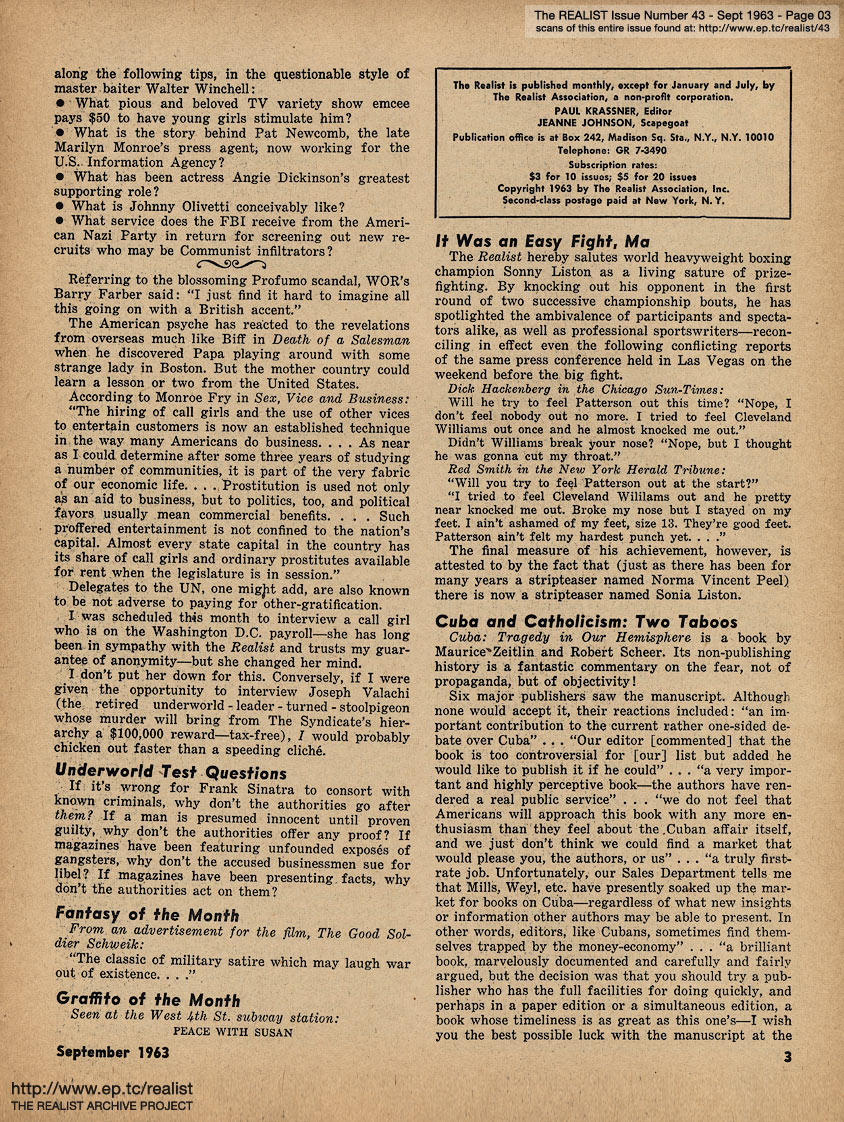 SEPTEMBER 1963 CONTENTS: Page 01: AN IMPOLITE INTERVIEW WITH MORT SAHL -- Page 02: EDITORIAL GIGGIES - A Non-Obituary for the Living - The Ordeal of Summerlane Camp - Sic Transit Ad Nauseum - How Yellow Was My Journalism -- Page 03: Underworld Test Questions - Fantasy of the Month - Graffito of the Month - It Was an Easy Fight, Ma - Cuba and Catholicism: Two Taboos -- Page 04: Pennies From Heaven - Sidelights of a Quiet Revolution -- Page 05: Rumor of the Month - Guilt By Telepathy - The Harassment of Lenny Bruce - Rehabilitation vs. Addiction - Of Morality and Monopoly - My Sun, My Sun - Hard-Core Pornography of the Month - and Advertisements We Somehow Doubt the Sincerity of ... -- Page 06: The Realist Philosophy - ODE TO THE TISHMAN BUILDING by Avery Corman and AH SORDID ANNOUNCEMENTS -- Page 07: EROS AND UNREASON IN ENGLAND by Bob Abel -- Page 08 -- Page 09: Fear Is a Four-Letter Word -- Page 10 -- Page 11 -- Page 12: REPORT FROM FARNSWORTH, N.J. -- Page 13: ANOTHER DAY, ANOTHER GHETTO -- Page 14: TERRY SOUTHERN INTERVIEWS A FAGGOT MALE NURSE -- Page 15 -- Page 16 -- Page 17 -- Page 18 -- Page 19 -- Page 20 -- Page 21 -- Page 22 -- Page 23: ATOMIC AGE NUTRITION by Marshall E. Deutsch -- Page 24 -- Page 25: THE RISK OF DEMOCRACY (Continued) -- Page 26 -- Page 27: News Item -- Page 28 -- Page 29: REGRESS REPORT #5: A SELF-APPOINTED MESSIAH by George von Hillsheimer -- Page 30 -- Page 31 -- Back Cover: A LETTER TO A GYNECOLOGIST by Mrs. Elliot Hirsch with A LETTER TO PATRICK KENNEDY by Paul Krassner and THE CASE OF TV GUIDE