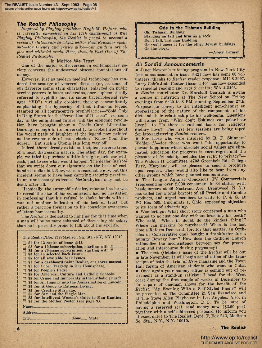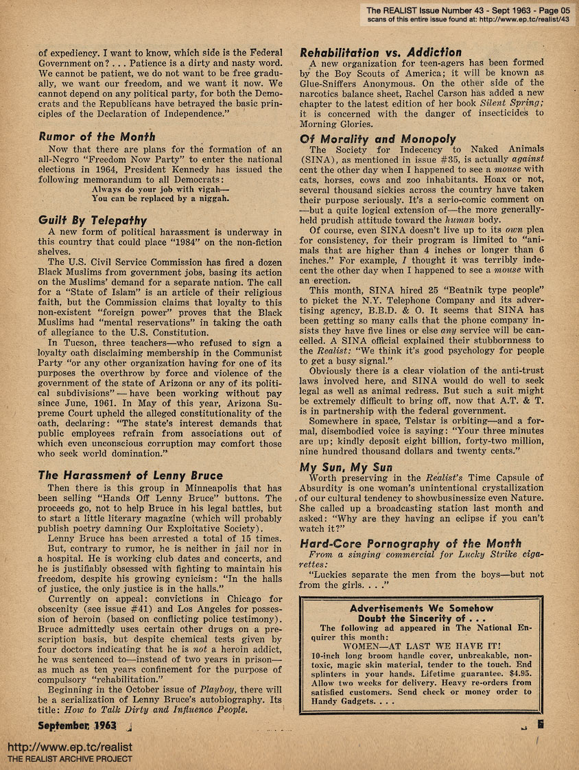 SEPTEMBER 1963 CONTENTS: Page 01: AN IMPOLITE INTERVIEW WITH MORT SAHL -- Page 02: EDITORIAL GIGGIES - A Non-Obituary for the Living - The Ordeal of Summerlane Camp - Sic Transit Ad Nauseum - How Yellow Was My Journalism -- Page 03: Underworld Test Questions - Fantasy of the Month - Graffito of the Month - It Was an Easy Fight, Ma - Cuba and Catholicism: Two Taboos -- Page 04: Pennies From Heaven - Sidelights of a Quiet Revolution -- Page 05: Rumor of the Month - Guilt By Telepathy - The Harassment of Lenny Bruce - Rehabilitation vs. Addiction - Of Morality and Monopoly - My Sun, My Sun - Hard-Core Pornography of the Month - and Advertisements We Somehow Doubt the Sincerity of ... -- Page 06: The Realist Philosophy - ODE TO THE TISHMAN BUILDING by Avery Corman and AH SORDID ANNOUNCEMENTS -- Page 07: EROS AND UNREASON IN ENGLAND by Bob Abel -- Page 08 -- Page 09: Fear Is a Four-Letter Word -- Page 10 -- Page 11 -- Page 12: REPORT FROM FARNSWORTH, N.J. -- Page 13: ANOTHER DAY, ANOTHER GHETTO -- Page 14: TERRY SOUTHERN INTERVIEWS A FAGGOT MALE NURSE -- Page 15 -- Page 16 -- Page 17 -- Page 18 -- Page 19 -- Page 20 -- Page 21 -- Page 22 -- Page 23: ATOMIC AGE NUTRITION by Marshall E. Deutsch -- Page 24 -- Page 25: THE RISK OF DEMOCRACY (Continued) -- Page 26 -- Page 27: News Item -- Page 28 -- Page 29: REGRESS REPORT #5: A SELF-APPOINTED MESSIAH by George von Hillsheimer -- Page 30 -- Page 31 -- Back Cover: A LETTER TO A GYNECOLOGIST by Mrs. Elliot Hirsch with A LETTER TO PATRICK KENNEDY by Paul Krassner and THE CASE OF TV GUIDE