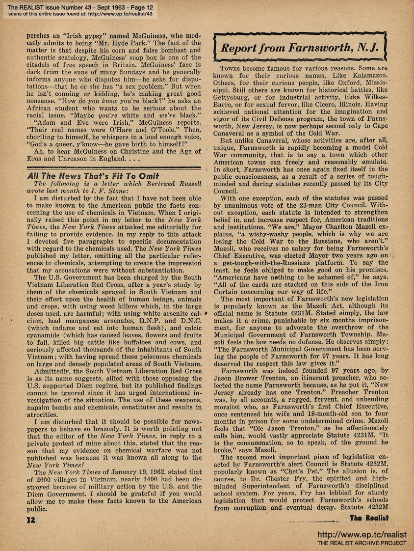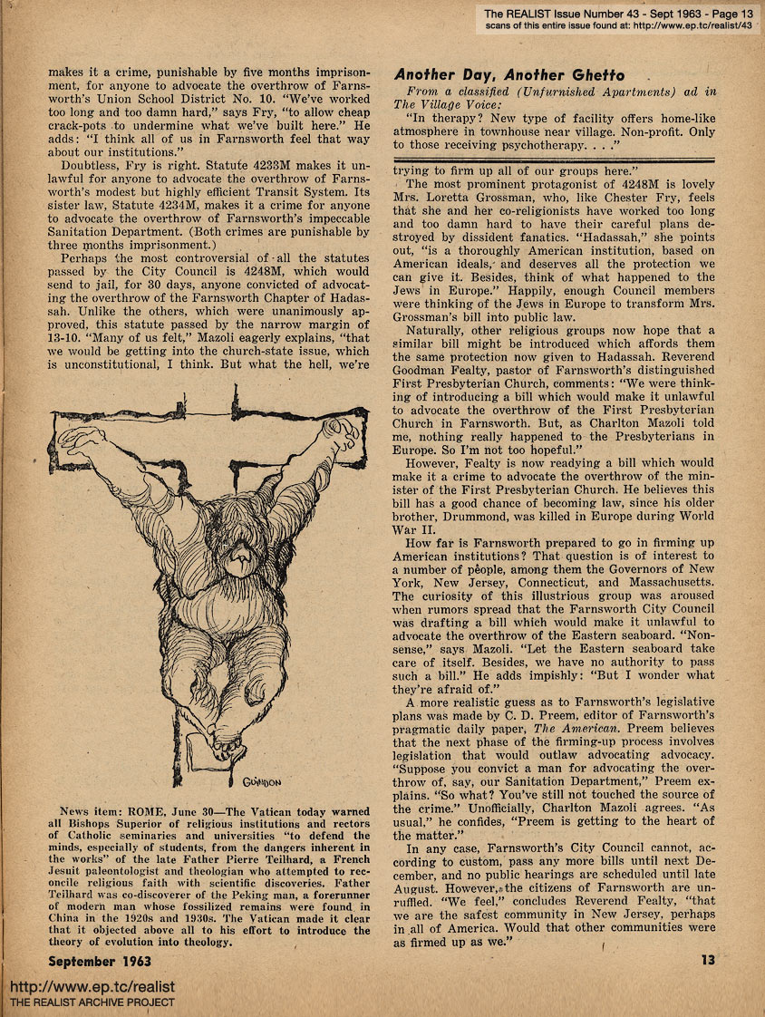 SEPTEMBER 1963 CONTENTS: Page 01: AN IMPOLITE INTERVIEW WITH MORT SAHL -- Page 02: EDITORIAL GIGGIES - A Non-Obituary for the Living - The Ordeal of Summerlane Camp - Sic Transit Ad Nauseum - How Yellow Was My Journalism -- Page 03: Underworld Test Questions - Fantasy of the Month - Graffito of the Month - It Was an Easy Fight, Ma - Cuba and Catholicism: Two Taboos -- Page 04: Pennies From Heaven - Sidelights of a Quiet Revolution -- Page 05: Rumor of the Month - Guilt By Telepathy - The Harassment of Lenny Bruce - Rehabilitation vs. Addiction - Of Morality and Monopoly - My Sun, My Sun - Hard-Core Pornography of the Month - and Advertisements We Somehow Doubt the Sincerity of ... -- Page 06: The Realist Philosophy - ODE TO THE TISHMAN BUILDING by Avery Corman and AH SORDID ANNOUNCEMENTS -- Page 07: EROS AND UNREASON IN ENGLAND by Bob Abel -- Page 08 -- Page 09: Fear Is a Four-Letter Word -- Page 10 -- Page 11 -- Page 12: REPORT FROM FARNSWORTH, N.J. -- Page 13: ANOTHER DAY, ANOTHER GHETTO -- Page 14: TERRY SOUTHERN INTERVIEWS A FAGGOT MALE NURSE -- Page 15 -- Page 16 -- Page 17 -- Page 18 -- Page 19 -- Page 20 -- Page 21 -- Page 22 -- Page 23: ATOMIC AGE NUTRITION by Marshall E. Deutsch -- Page 24 -- Page 25: THE RISK OF DEMOCRACY (Continued) -- Page 26 -- Page 27: News Item -- Page 28 -- Page 29: REGRESS REPORT #5: A SELF-APPOINTED MESSIAH by George von Hillsheimer -- Page 30 -- Page 31 -- Back Cover: A LETTER TO A GYNECOLOGIST by Mrs. Elliot Hirsch with A LETTER TO PATRICK KENNEDY by Paul Krassner and THE CASE OF TV GUIDE