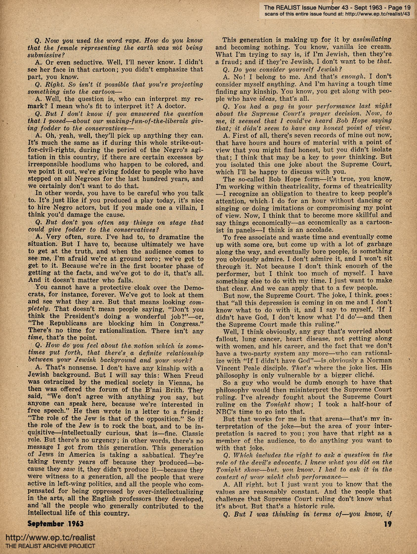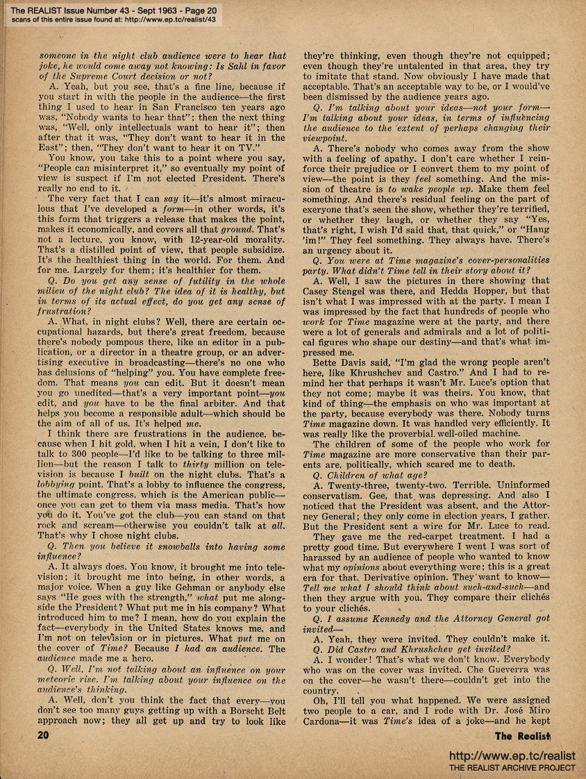 SEPTEMBER 1963 CONTENTS: Page 01: AN IMPOLITE INTERVIEW WITH MORT SAHL -- Page 02: EDITORIAL GIGGIES - A Non-Obituary for the Living - The Ordeal of Summerlane Camp - Sic Transit Ad Nauseum - How Yellow Was My Journalism -- Page 03: Underworld Test Questions - Fantasy of the Month - Graffito of the Month - It Was an Easy Fight, Ma - Cuba and Catholicism: Two Taboos -- Page 04: Pennies From Heaven - Sidelights of a Quiet Revolution -- Page 05: Rumor of the Month - Guilt By Telepathy - The Harassment of Lenny Bruce - Rehabilitation vs. Addiction - Of Morality and Monopoly - My Sun, My Sun - Hard-Core Pornography of the Month - and Advertisements We Somehow Doubt the Sincerity of ... -- Page 06: The Realist Philosophy - ODE TO THE TISHMAN BUILDING by Avery Corman and AH SORDID ANNOUNCEMENTS -- Page 07: EROS AND UNREASON IN ENGLAND by Bob Abel -- Page 08 -- Page 09: Fear Is a Four-Letter Word -- Page 10 -- Page 11 -- Page 12: REPORT FROM FARNSWORTH, N.J. -- Page 13: ANOTHER DAY, ANOTHER GHETTO -- Page 14: TERRY SOUTHERN INTERVIEWS A FAGGOT MALE NURSE -- Page 15 -- Page 16 -- Page 17 -- Page 18 -- Page 19 -- Page 20 -- Page 21 -- Page 22 -- Page 23: ATOMIC AGE NUTRITION by Marshall E. Deutsch -- Page 24 -- Page 25: THE RISK OF DEMOCRACY (Continued) -- Page 26 -- Page 27: News Item -- Page 28 -- Page 29: REGRESS REPORT #5: A SELF-APPOINTED MESSIAH by George von Hillsheimer -- Page 30 -- Page 31 -- Back Cover: A LETTER TO A GYNECOLOGIST by Mrs. Elliot Hirsch with A LETTER TO PATRICK KENNEDY by Paul Krassner and THE CASE OF TV GUIDE
