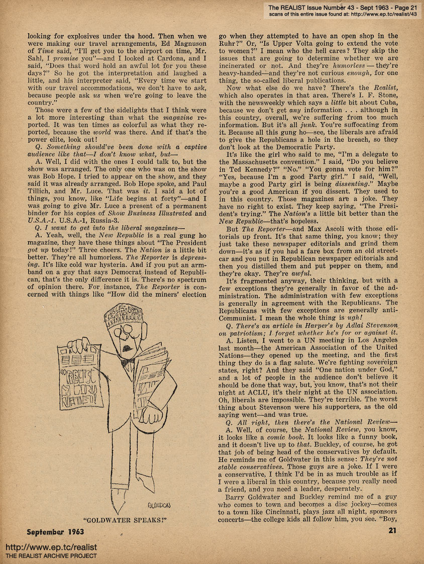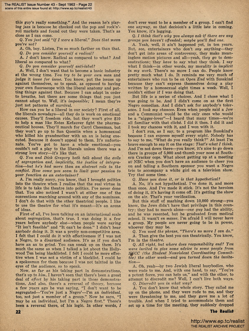 SEPTEMBER 1963 CONTENTS: Page 01: AN IMPOLITE INTERVIEW WITH MORT SAHL -- Page 02: EDITORIAL GIGGIES - A Non-Obituary for the Living - The Ordeal of Summerlane Camp - Sic Transit Ad Nauseum - How Yellow Was My Journalism -- Page 03: Underworld Test Questions - Fantasy of the Month - Graffito of the Month - It Was an Easy Fight, Ma - Cuba and Catholicism: Two Taboos -- Page 04: Pennies From Heaven - Sidelights of a Quiet Revolution -- Page 05: Rumor of the Month - Guilt By Telepathy - The Harassment of Lenny Bruce - Rehabilitation vs. Addiction - Of Morality and Monopoly - My Sun, My Sun - Hard-Core Pornography of the Month - and Advertisements We Somehow Doubt the Sincerity of ... -- Page 06: The Realist Philosophy - ODE TO THE TISHMAN BUILDING by Avery Corman and AH SORDID ANNOUNCEMENTS -- Page 07: EROS AND UNREASON IN ENGLAND by Bob Abel -- Page 08 -- Page 09: Fear Is a Four-Letter Word -- Page 10 -- Page 11 -- Page 12: REPORT FROM FARNSWORTH, N.J. -- Page 13: ANOTHER DAY, ANOTHER GHETTO -- Page 14: TERRY SOUTHERN INTERVIEWS A FAGGOT MALE NURSE -- Page 15 -- Page 16 -- Page 17 -- Page 18 -- Page 19 -- Page 20 -- Page 21 -- Page 22 -- Page 23: ATOMIC AGE NUTRITION by Marshall E. Deutsch -- Page 24 -- Page 25: THE RISK OF DEMOCRACY (Continued) -- Page 26 -- Page 27: News Item -- Page 28 -- Page 29: REGRESS REPORT #5: A SELF-APPOINTED MESSIAH by George von Hillsheimer -- Page 30 -- Page 31 -- Back Cover: A LETTER TO A GYNECOLOGIST by Mrs. Elliot Hirsch with A LETTER TO PATRICK KENNEDY by Paul Krassner and THE CASE OF TV GUIDE