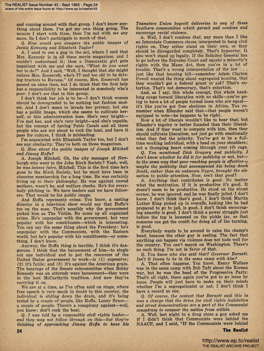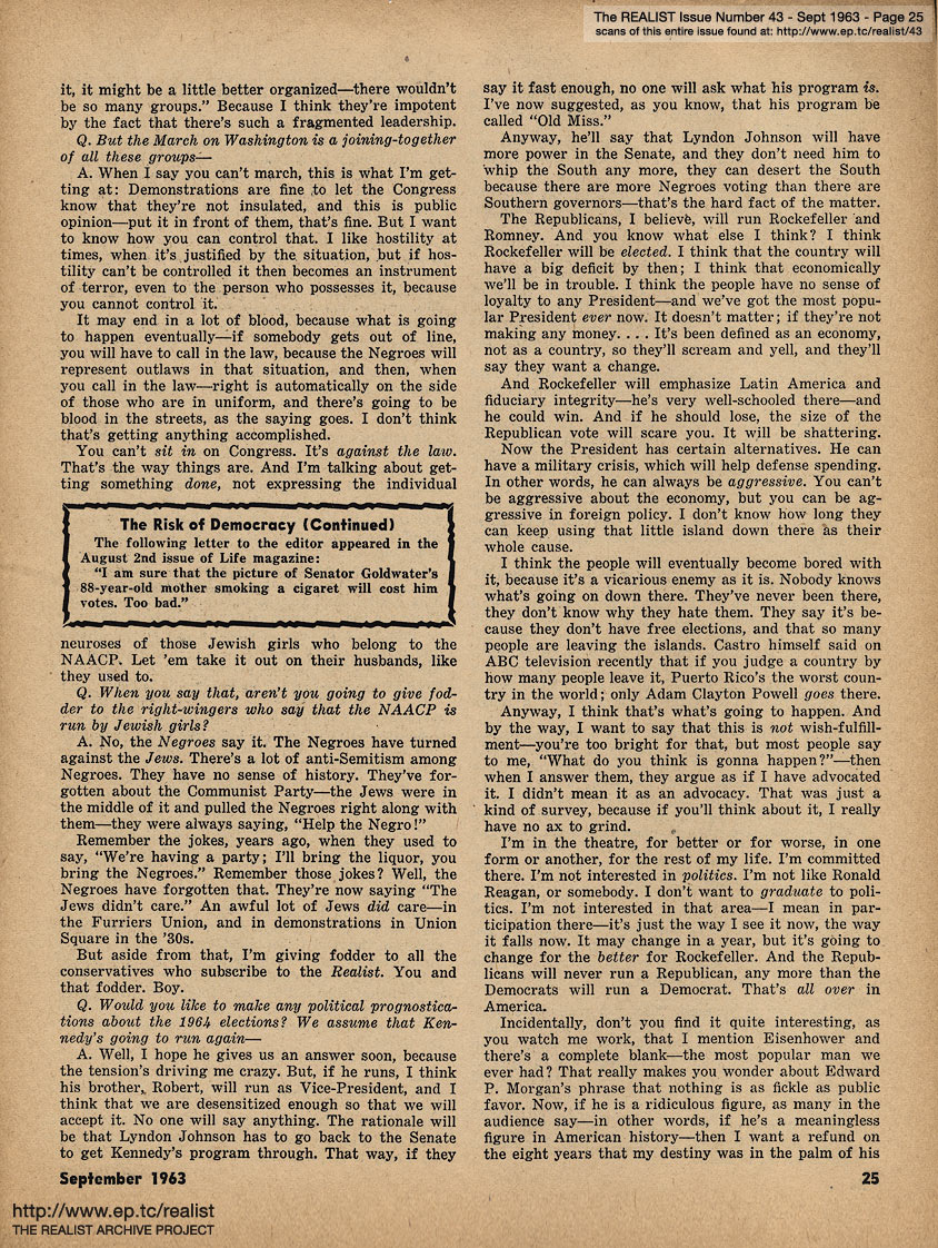 SEPTEMBER 1963 CONTENTS: Page 01: AN IMPOLITE INTERVIEW WITH MORT SAHL -- Page 02: EDITORIAL GIGGIES - A Non-Obituary for the Living - The Ordeal of Summerlane Camp - Sic Transit Ad Nauseum - How Yellow Was My Journalism -- Page 03: Underworld Test Questions - Fantasy of the Month - Graffito of the Month - It Was an Easy Fight, Ma - Cuba and Catholicism: Two Taboos -- Page 04: Pennies From Heaven - Sidelights of a Quiet Revolution -- Page 05: Rumor of the Month - Guilt By Telepathy - The Harassment of Lenny Bruce - Rehabilitation vs. Addiction - Of Morality and Monopoly - My Sun, My Sun - Hard-Core Pornography of the Month - and Advertisements We Somehow Doubt the Sincerity of ... -- Page 06: The Realist Philosophy - ODE TO THE TISHMAN BUILDING by Avery Corman and AH SORDID ANNOUNCEMENTS -- Page 07: EROS AND UNREASON IN ENGLAND by Bob Abel -- Page 08 -- Page 09: Fear Is a Four-Letter Word -- Page 10 -- Page 11 -- Page 12: REPORT FROM FARNSWORTH, N.J. -- Page 13: ANOTHER DAY, ANOTHER GHETTO -- Page 14: TERRY SOUTHERN INTERVIEWS A FAGGOT MALE NURSE -- Page 15 -- Page 16 -- Page 17 -- Page 18 -- Page 19 -- Page 20 -- Page 21 -- Page 22 -- Page 23: ATOMIC AGE NUTRITION by Marshall E. Deutsch -- Page 24 -- Page 25: THE RISK OF DEMOCRACY (Continued) -- Page 26 -- Page 27: News Item -- Page 28 -- Page 29: REGRESS REPORT #5: A SELF-APPOINTED MESSIAH by George von Hillsheimer -- Page 30 -- Page 31 -- Back Cover: A LETTER TO A GYNECOLOGIST by Mrs. Elliot Hirsch with A LETTER TO PATRICK KENNEDY by Paul Krassner and THE CASE OF TV GUIDE