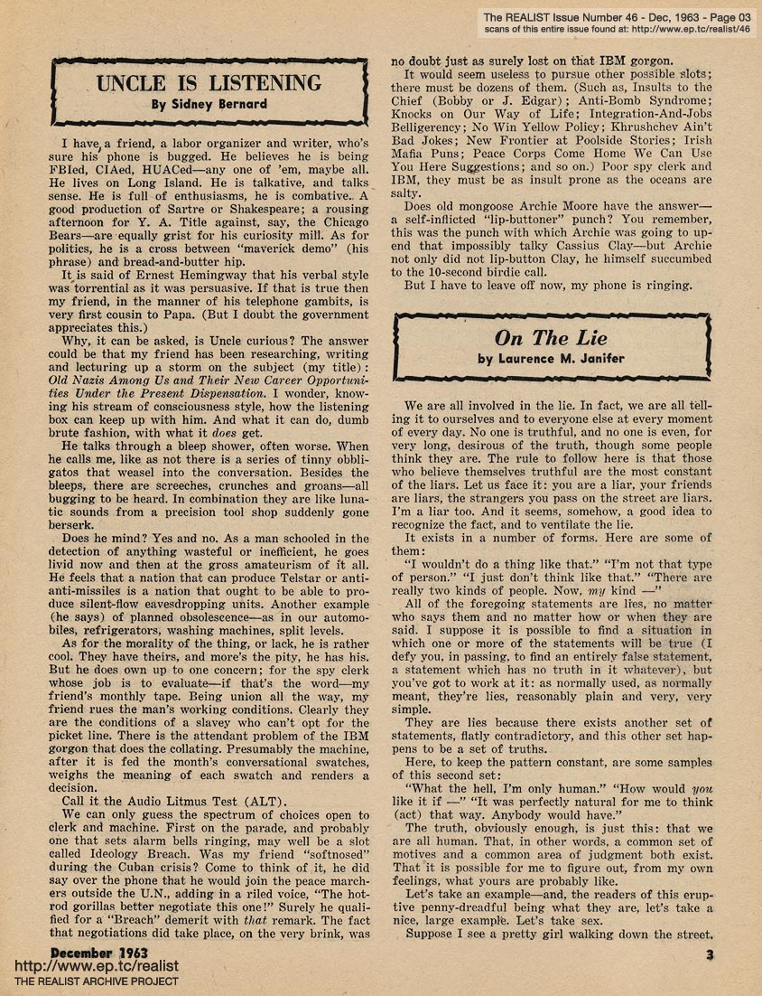 DECEMBER 1963 CONTENTS: Page 01: IN SUPPORT OF ANOTHER EXCHANGE OF NOTES (a little thing on the wiretapping-Negro-Jewish-repression-in-Russia-and-America-today theme ...) by Peter Edler -- Page 02: HOW TO GET RICH by Marshall E. Deutsch -- Page 03: UNCLE IS LISTENING by Sidney Bernard and ON THE LIE by Laurence M. Janifer -- Page 04 -- Page 05: THE TRIAL OF EROS MAGAZINE - PART THREE - CONCLUSION -- Page 06 -- Page 07 -- Page 08 -- Page 09 -- Page 10 -- Page 11 -- Page 12 -- Page 13 -- Page 14 -- Page 15: CO-EXISTING by Saul Heller -- Back Cover