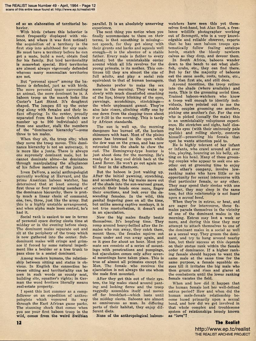 APRIL 1964 CONTENTS: Page 01: LETTERS TO THE EDITOR - On Norman Mailer - For Norman Mailer -- Page 02: ON BEING HUMAN by Laurence M. Janifer -- Page 03: HOW TO ELIMINATE THE NATION'S MOST POPULAR SUICIDE WEAPON by Richard Condon -- Page 04 -- Page 05 -- Page 06: OUT OF ORDER by Marshall E. Deutsch -- Page 07: DIABOLIC DIALOGUES by Joe E. Brown, Jr. -- Page 08 -- Page 09: SEX IN THE SINGLE BABOON by John Bleibtreu -- Page 10 -- Page 11 -- Page 12 -- Page 13 -- Page 14: SEX AND THE SINGLE HERMAPHRODITE by Jack Richardson -- Page 15: LETTERS TO THE EDITOR (continued) - On the Other Hand -- Page 16: Race Relations - Unsolicited - On William Worthy - The Labelers - Anonymous Letter - The People Project - Has the Answer -- Page 17: The Contraceptive Bit - Semantic Confusion - Organized Suicide - One Cartoon, Under Fire -- Page 18: On Terry Southern - On Jean Shepherd - Father of the Year - Peace and Conscience - Drafteesville - Page 19: Clarification - New Insight - The Trading-Stamp Habit - Interpretation - On Mort Sahl - On Albert Ellis - The Split in Generations - Upset -- Page 20: On Lenny Bruce - New Job Category - Re: "Wonderings" - Anonymous Telegram - On Madalyn Murray -- Page 21: Equal Time - Were There Any Witnesses - New Reader - High School Stay-Ins -- Page 22: Neil Postman's Report - Kosher to Hate Germans? - Challenge to Consistency - And Speaking of ... -- Page 23: Putnam's Modest Proposals - Another Cause - Down Under - Object Lesson -- Page 24: Disagreement - Max Got His Gun - The Mother Country - Letter to Patrick Kennedy - Bad Taste Dept. - Assassination Aftermath -- Page 25: Nothing Left - Report From Cape Kennedy - Permission Granted - Guindon's Cartoon - And Other Parents -- Page 26: And Then Again - Corrective Items - On Joseph Heller - Temporary Need? On A Self-Styled Phony -- Page 27: Editorial Giggy - Exploding a Myth - Realmate of the Month - Snobby College Kid -- Page 28: The Trial of Eros - The Mass Murderer - The Price of Loyalty - Jewish Atrocity -- Page 29 -- Page 30: The Jewish Building - Hindsight and Foreskin - Egghead Racists -- Page 31: The Frightened Ones - Crank Mail - Space Theology - More Rumors -- Back Cover: Another Clarification - Nothing in Common - Schizoid Reactions - And Finally...
