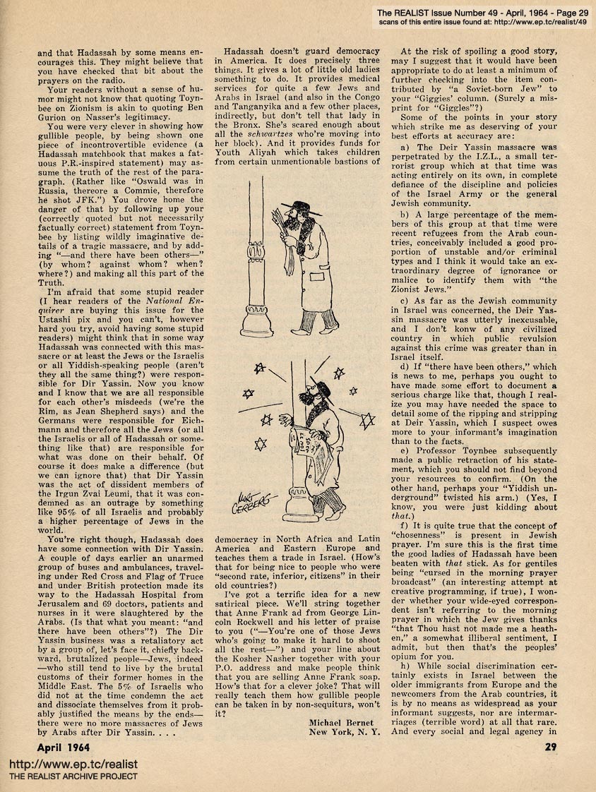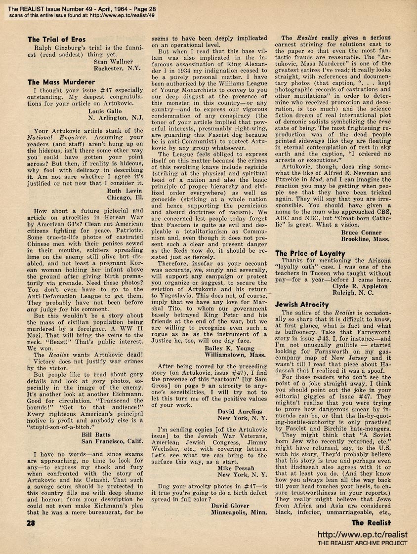 APRIL 1964 CONTENTS: Page 01: LETTERS TO THE EDITOR - On Norman Mailer - For Norman Mailer -- Page 02: ON BEING HUMAN by Laurence M. Janifer -- Page 03: HOW TO ELIMINATE THE NATION'S MOST POPULAR SUICIDE WEAPON by Richard Condon -- Page 04 -- Page 05 -- Page 06: OUT OF ORDER by Marshall E. Deutsch -- Page 07: DIABOLIC DIALOGUES by Joe E. Brown, Jr. -- Page 08 -- Page 09: SEX IN THE SINGLE BABOON by John Bleibtreu -- Page 10 -- Page 11 -- Page 12 -- Page 13 -- Page 14: SEX AND THE SINGLE HERMAPHRODITE by Jack Richardson -- Page 15: LETTERS TO THE EDITOR (continued) - On the Other Hand -- Page 16: Race Relations - Unsolicited - On William Worthy - The Labelers - Anonymous Letter - The People Project - Has the Answer -- Page 17: The Contraceptive Bit - Semantic Confusion - Organized Suicide - One Cartoon, Under Fire -- Page 18: On Terry Southern - On Jean Shepherd - Father of the Year - Peace and Conscience - Drafteesville - Page 19: Clarification - New Insight - The Trading-Stamp Habit - Interpretation - On Mort Sahl - On Albert Ellis - The Split in Generations - Upset -- Page 20: On Lenny Bruce - New Job Category - Re: "Wonderings" - Anonymous Telegram - On Madalyn Murray -- Page 21: Equal Time - Were There Any Witnesses - New Reader - High School Stay-Ins -- Page 22: Neil Postman's Report - Kosher to Hate Germans? - Challenge to Consistency - And Speaking of ... -- Page 23: Putnam's Modest Proposals - Another Cause - Down Under - Object Lesson -- Page 24: Disagreement - Max Got His Gun - The Mother Country - Letter to Patrick Kennedy - Bad Taste Dept. - Assassination Aftermath -- Page 25: Nothing Left - Report From Cape Kennedy - Permission Granted - Guindon's Cartoon - And Other Parents -- Page 26: And Then Again - Corrective Items - On Joseph Heller - Temporary Need? On A Self-Styled Phony -- Page 27: Editorial Giggy - Exploding a Myth - Realmate of the Month - Snobby College Kid -- Page 28: The Trial of Eros - The Mass Murderer - The Price of Loyalty - Jewish Atrocity -- Page 29 -- Page 30: The Jewish Building - Hindsight and Foreskin - Egghead Racists -- Page 31: The Frightened Ones - Crank Mail - Space Theology - More Rumors -- Back Cover: Another Clarification - Nothing in Common - Schizoid Reactions - And Finally...