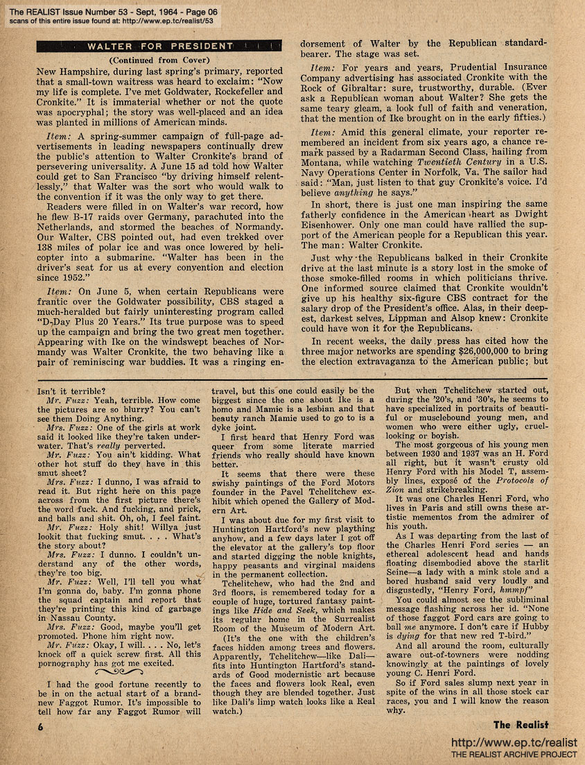 SEPTEMBER 1964 CONTENTS: Page 01: MADALYN MURRAY FOR MISCREANT by Madalyn E. Murray and WALTER CRONKITE FOR PRESIDENT by Joel Liber -- Page 02: EDITORIAL GIGGIES - Newsweek and The Realist - What's Your Rationalization? - The Invisible Telephone Company - Birth of the Blue -- Page 03: ED FISHER'S (HALF) PAGE and Signs Along the Cynic Route -- Page 04: Schmuck of the Month - Ah Sordid Announcements - The Crackpot and the Evidence -- Page 05: CONSPIRACY THEORIES AND A FAGGOT RUMOR by Nat Freedland -- Page 06 -- Page 07 -- Page 08 -- Page 09: Theodore Sturgeon's UNSETTLEMENT HOUSE and EDITORIAL DINGLEBERRIES -- Page 10: ANOTHER SUBSIDY by Mike Jasnow -- Page 11: THE PORTABLE GOLDWATER by Dick Guindon -- Page 12: THE UNSINKABLE MARGUERITE OSWALD by Harold Feldman -- Page 13 -- Page 14 -- Page 15 -- Page 16 -- Page 17 -- Page 18 -- Page 19: AN ANSWER TO MADALYN MURRAY -- Page 20 -- Page 21: AN ANSWER TO LEMOIN CREE by Mae Mallory -- Page 22 -- Page 23: THE WARREN REPORT and ROMANTICIST OF THE YEAR AWARD -- Back Cover: DIABOLIC DIALOGUES and DICK GREGORY SAYS...