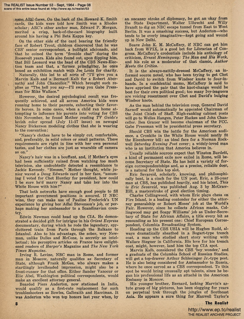 SEPTEMBER 1964 CONTENTS: Page 01: MADALYN MURRAY FOR MISCREANT by Madalyn E. Murray and WALTER CRONKITE FOR PRESIDENT by Joel Liber -- Page 02: EDITORIAL GIGGIES - Newsweek and The Realist - What's Your Rationalization? - The Invisible Telephone Company - Birth of the Blue -- Page 03: ED FISHER'S (HALF) PAGE and Signs Along the Cynic Route -- Page 04: Schmuck of the Month - Ah Sordid Announcements - The Crackpot and the Evidence -- Page 05: CONSPIRACY THEORIES AND A FAGGOT RUMOR by Nat Freedland -- Page 06 -- Page 07 -- Page 08 -- Page 09: Theodore Sturgeon's UNSETTLEMENT HOUSE and EDITORIAL DINGLEBERRIES -- Page 10: ANOTHER SUBSIDY by Mike Jasnow -- Page 11: THE PORTABLE GOLDWATER by Dick Guindon -- Page 12: THE UNSINKABLE MARGUERITE OSWALD by Harold Feldman -- Page 13 -- Page 14 -- Page 15 -- Page 16 -- Page 17 -- Page 18 -- Page 19: AN ANSWER TO MADALYN MURRAY -- Page 20 -- Page 21: AN ANSWER TO LEMOIN CREE by Mae Mallory -- Page 22 -- Page 23: THE WARREN REPORT and ROMANTICIST OF THE YEAR AWARD -- Back Cover: DIABOLIC DIALOGUES and DICK GREGORY SAYS...