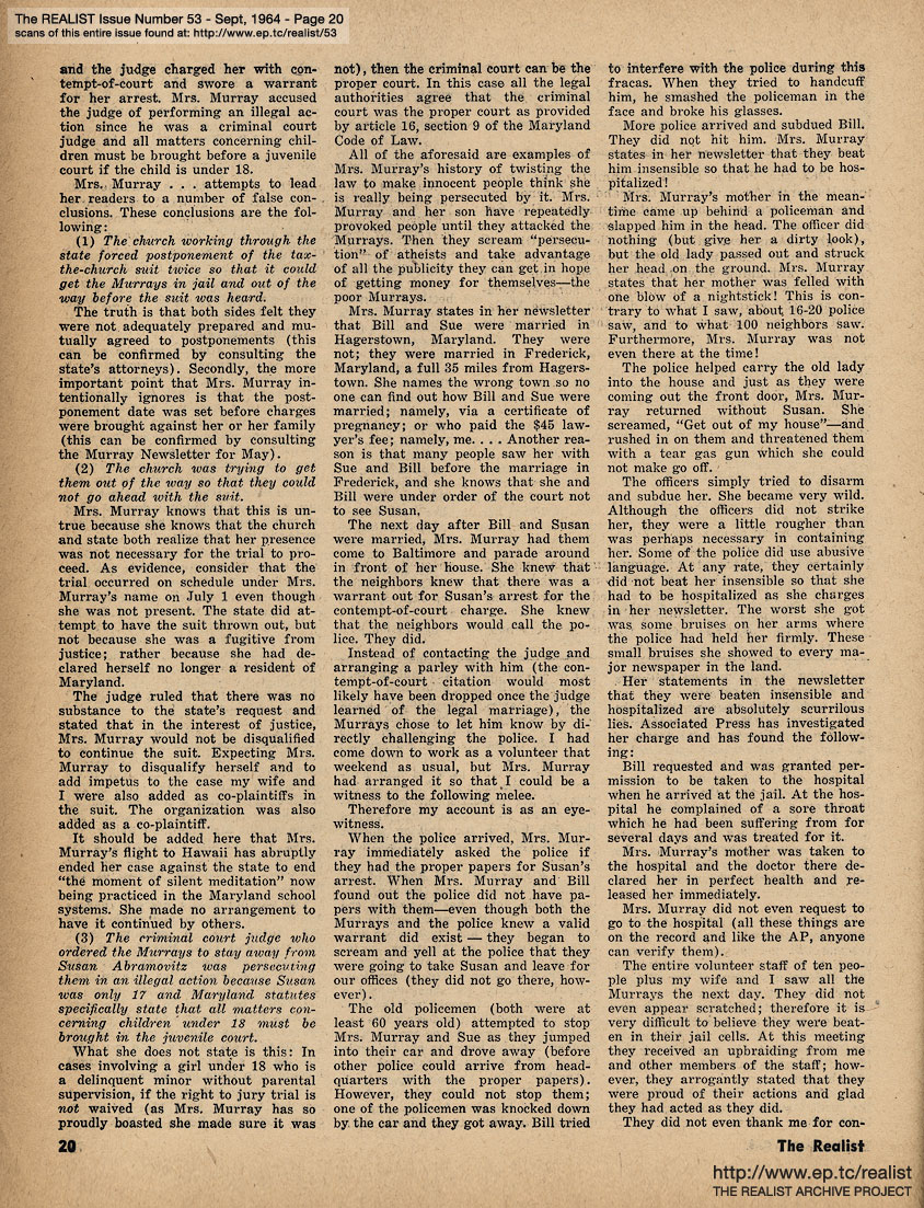 SEPTEMBER 1964 CONTENTS: Page 01: MADALYN MURRAY FOR MISCREANT by Madalyn E. Murray and WALTER CRONKITE FOR PRESIDENT by Joel Liber -- Page 02: EDITORIAL GIGGIES - Newsweek and The Realist - What's Your Rationalization? - The Invisible Telephone Company - Birth of the Blue -- Page 03: ED FISHER'S (HALF) PAGE and Signs Along the Cynic Route -- Page 04: Schmuck of the Month - Ah Sordid Announcements - The Crackpot and the Evidence -- Page 05: CONSPIRACY THEORIES AND A FAGGOT RUMOR by Nat Freedland -- Page 06 -- Page 07 -- Page 08 -- Page 09: Theodore Sturgeon's UNSETTLEMENT HOUSE and EDITORIAL DINGLEBERRIES -- Page 10: ANOTHER SUBSIDY by Mike Jasnow -- Page 11: THE PORTABLE GOLDWATER by Dick Guindon -- Page 12: THE UNSINKABLE MARGUERITE OSWALD by Harold Feldman -- Page 13 -- Page 14 -- Page 15 -- Page 16 -- Page 17 -- Page 18 -- Page 19: AN ANSWER TO MADALYN MURRAY -- Page 20 -- Page 21: AN ANSWER TO LEMOIN CREE by Mae Mallory -- Page 22 -- Page 23: THE WARREN REPORT and ROMANTICIST OF THE YEAR AWARD -- Back Cover: DIABOLIC DIALOGUES and DICK GREGORY SAYS...