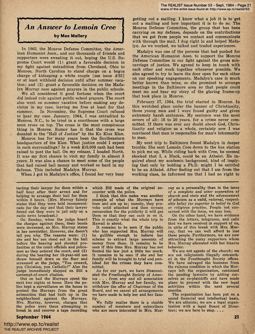 SEPTEMBER 1964 CONTENTS: Page 01: MADALYN MURRAY FOR MISCREANT by Madalyn E. Murray and WALTER CRONKITE FOR PRESIDENT by Joel Liber -- Page 02: EDITORIAL GIGGIES - Newsweek and The Realist - What's Your Rationalization? - The Invisible Telephone Company - Birth of the Blue -- Page 03: ED FISHER'S (HALF) PAGE and Signs Along the Cynic Route -- Page 04: Schmuck of the Month - Ah Sordid Announcements - The Crackpot and the Evidence -- Page 05: CONSPIRACY THEORIES AND A FAGGOT RUMOR by Nat Freedland -- Page 06 -- Page 07 -- Page 08 -- Page 09: Theodore Sturgeon's UNSETTLEMENT HOUSE and EDITORIAL DINGLEBERRIES -- Page 10: ANOTHER SUBSIDY by Mike Jasnow -- Page 11: THE PORTABLE GOLDWATER by Dick Guindon -- Page 12: THE UNSINKABLE MARGUERITE OSWALD by Harold Feldman -- Page 13 -- Page 14 -- Page 15 -- Page 16 -- Page 17 -- Page 18 -- Page 19: AN ANSWER TO MADALYN MURRAY -- Page 20 -- Page 21: AN ANSWER TO LEMOIN CREE by Mae Mallory -- Page 22 -- Page 23: THE WARREN REPORT and ROMANTICIST OF THE YEAR AWARD -- Back Cover: DIABOLIC DIALOGUES and DICK GREGORY SAYS...