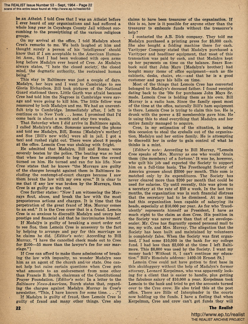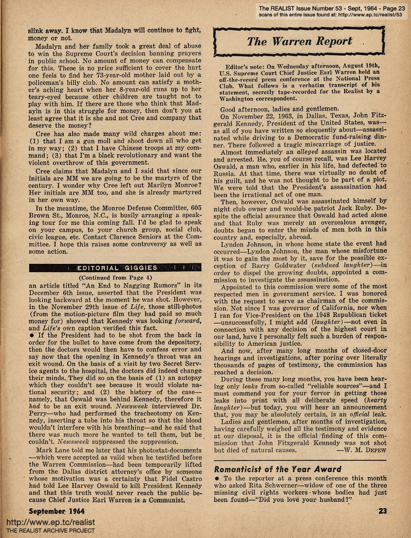 SEPTEMBER 1964 CONTENTS: Page 01: MADALYN MURRAY FOR MISCREANT by Madalyn E. Murray and WALTER CRONKITE FOR PRESIDENT by Joel Liber -- Page 02: EDITORIAL GIGGIES - Newsweek and The Realist - What's Your Rationalization? - The Invisible Telephone Company - Birth of the Blue -- Page 03: ED FISHER'S (HALF) PAGE and Signs Along the Cynic Route -- Page 04: Schmuck of the Month - Ah Sordid Announcements - The Crackpot and the Evidence -- Page 05: CONSPIRACY THEORIES AND A FAGGOT RUMOR by Nat Freedland -- Page 06 -- Page 07 -- Page 08 -- Page 09: Theodore Sturgeon's UNSETTLEMENT HOUSE and EDITORIAL DINGLEBERRIES -- Page 10: ANOTHER SUBSIDY by Mike Jasnow -- Page 11: THE PORTABLE GOLDWATER by Dick Guindon -- Page 12: THE UNSINKABLE MARGUERITE OSWALD by Harold Feldman -- Page 13 -- Page 14 -- Page 15 -- Page 16 -- Page 17 -- Page 18 -- Page 19: AN ANSWER TO MADALYN MURRAY -- Page 20 -- Page 21: AN ANSWER TO LEMOIN CREE by Mae Mallory -- Page 22 -- Page 23: THE WARREN REPORT and ROMANTICIST OF THE YEAR AWARD -- Back Cover: DIABOLIC DIALOGUES and DICK GREGORY SAYS...
