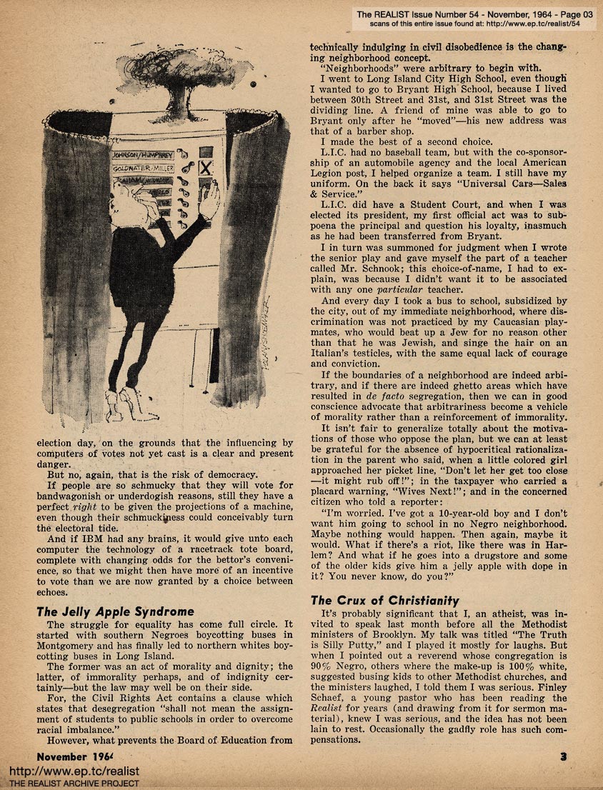 NOVEMBER 1964 CONTENTS: Page 01: THE FECALPHILES by Lenny Bruce -- Page 02: EDITORIAL GIGGIES -- Page 03 -- Page 04 -- Page 05: GUINDON GOES TO A RESERVATION by Dick Guindon -- Page 06 -- Page 07 -- Page 08 -- Page 09: WOMEN, CHILDREN AND AMERICANS FIRST by Paul Encimer -- Page 10 -- Page 11 -- Page 12 -- Page 13: THE KING HAS TOO MANY CLOTHES ON by Robert Paul Smith -- Page 14 -- Page 15 -- "LOOK—MA...NO SCULPTURES!" -- Page 16: OVERHEARD by J. Hoberman -- Page 17: SIR REALIST (letters) -- Page 18: ED FISHER'S PAGE by Ed Fisher -- Page 19 -- Page 20: THE ORDEAL OF ALTRUISM (Lower Eastside Action Project) by Laurence S. Cole -- Page 21 -- Page 22 -- Page 23: THINGS OF THE MONTH -- Back Cover: THE BATHROOM IN BUDAPEST by John Goodwin