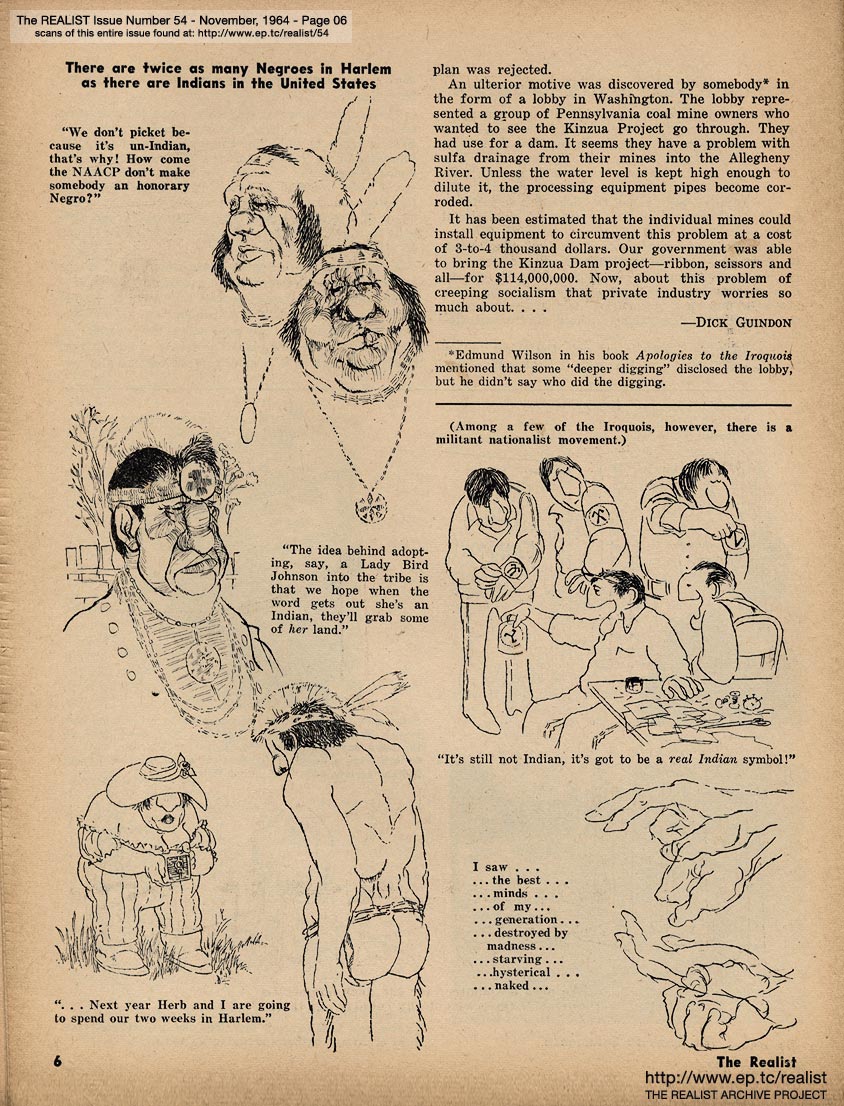 NOVEMBER 1964 CONTENTS: Page 01: THE FECALPHILES by Lenny Bruce -- Page 02: EDITORIAL GIGGIES -- Page 03 -- Page 04 -- Page 05: GUINDON GOES TO A RESERVATION by Dick Guindon -- Page 06 -- Page 07 -- Page 08 -- Page 09: WOMEN, CHILDREN AND AMERICANS FIRST by Paul Encimer -- Page 10 -- Page 11 -- Page 12 -- Page 13: THE KING HAS TOO MANY CLOTHES ON by Robert Paul Smith -- Page 14 -- Page 15 -- "LOOK—MA...NO SCULPTURES!" -- Page 16: OVERHEARD by J. Hoberman -- Page 17: SIR REALIST (letters) -- Page 18: ED FISHER'S PAGE by Ed Fisher -- Page 19 -- Page 20: THE ORDEAL OF ALTRUISM (Lower Eastside Action Project) by Laurence S. Cole -- Page 21 -- Page 22 -- Page 23: THINGS OF THE MONTH -- Back Cover: THE BATHROOM IN BUDAPEST by John Goodwin