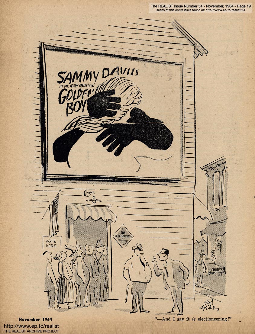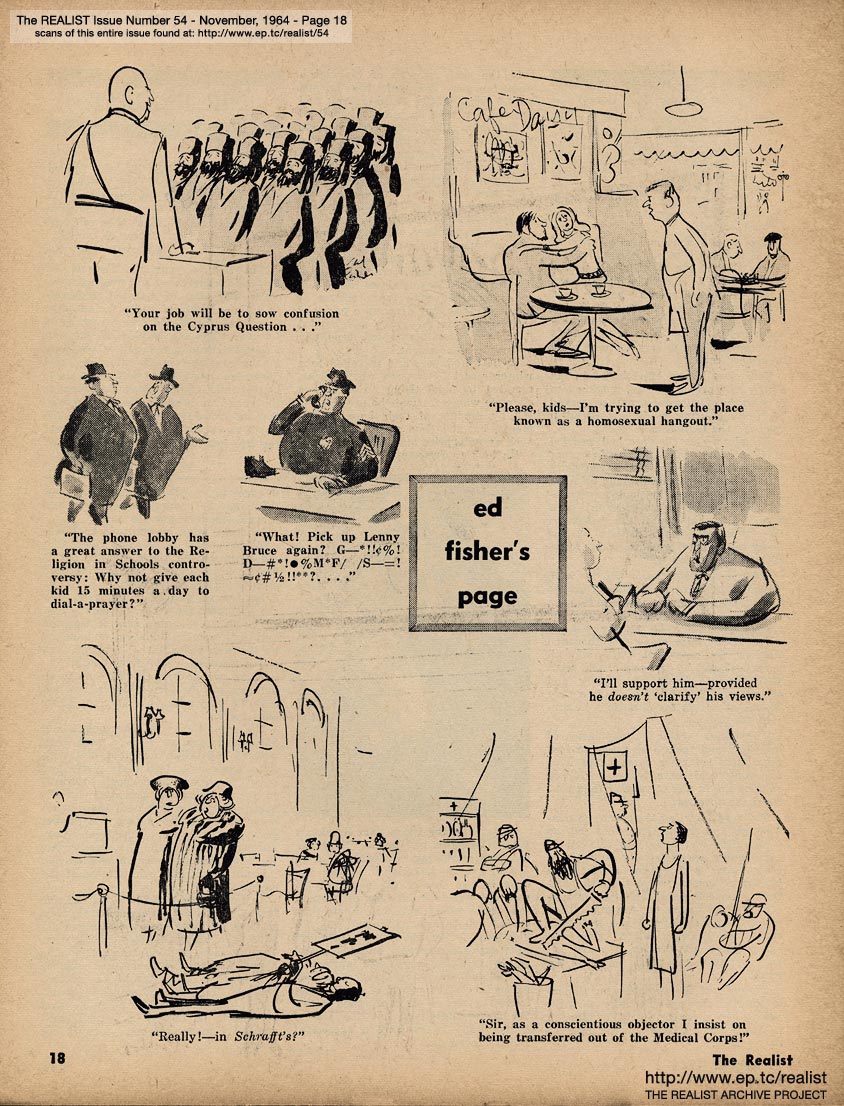 NOVEMBER 1964 CONTENTS: Page 01: THE FECALPHILES by Lenny Bruce -- Page 02: EDITORIAL GIGGIES -- Page 03 -- Page 04 -- Page 05: GUINDON GOES TO A RESERVATION by Dick Guindon -- Page 06 -- Page 07 -- Page 08 -- Page 09: WOMEN, CHILDREN AND AMERICANS FIRST by Paul Encimer -- Page 10 -- Page 11 -- Page 12 -- Page 13: THE KING HAS TOO MANY CLOTHES ON by Robert Paul Smith -- Page 14 -- Page 15 -- "LOOK—MA...NO SCULPTURES!" -- Page 16: OVERHEARD by J. Hoberman -- Page 17: SIR REALIST (letters) -- Page 18: ED FISHER'S PAGE by Ed Fisher -- Page 19 -- Page 20: THE ORDEAL OF ALTRUISM (Lower Eastside Action Project) by Laurence S. Cole -- Page 21 -- Page 22 -- Page 23: THINGS OF THE MONTH -- Back Cover: THE BATHROOM IN BUDAPEST by John Goodwin