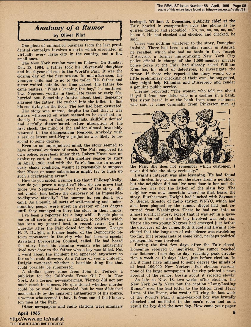 APRIL 1965 CONTENTS: Page 01: DICK GREGORY AND HIS MISSISSIPPI AIRLIFT - WOODY ALLEN AND HIS IMPOLITE INTERVIEW - and - STEVE ALLEN AND HIS CHINESE A-BOMB -- Page 02: EDITORIAL GIGGLES: The Truth Shall Make You Impotent - No Abortions Against This Wall -- Page 03: Signs Along the Cynic Route - The Free Speech Pill Smugglers - Riddle of the Month - Fink Foils Fascist Fomenting Fag Fest -- Page 04: The Height of Morality - Lenny Bruce is Alive, By the Way - and - AH SORDID ANNOUNCEMENTS -- Page 05: ANATOMY OF A RUMOR by Oliver Pilat -- Page 06 -- Page 07: SON OF TV'S FINEST HOUR by Tad Richards - and - The REALIST'S QUERY OF THE MONTH -- Page 08: BOB ABEL'S CRAP COLUMN: Malignant Humanitarianism Awards - Requiem for an Overrate - Cooz for Mr. Charlie -- Page 09: ED FISHER'S PAGE -- Page 10 -- Page 11 -- Page 12 -- Page 13 -- Page 14 -- Page 15 -- Page 16: THREE AUTHORS IN SEARCH OF OBSCENE LITERATURE (or–Lucky Carol, she's in the middle!) by Alfred Bolton, Carol Glaser, and John Francis Putnam -- Page 17: EXHIBIT A -- Page 18: SEND THIS BOY TO CAMP -- Page 19: AN EXPOSÉ BY A LITTLE OLD LADY as told to Stanley Koven -- Page 20 -- RUMOR OF THE MONTH -- Page 21 THE REALIST'S WOMEN'S PAGE: What's New In Fashion? - If the Procrustean Surgery Fits ... I dreamed I shot a nigger in my maidenform bra - and - FREE ENTERPRISE IN ACTION by Marcia Seligson and Janet Sorkin -- Page 22: STATISTICAL SUGGESTIONS -- Page 23 -- Page 24 -- Page 25 -- Page 26 -- Page 27 -- Page 28 -- Page 29: AN OPEN LETTER TO WILLAIM F. BUCKLEY, JR. -- Page 30 -- Page 31: The PARADOX OF RIGHTEOUSNESS -- BACK COVER: SOFT-CORE PORNOGRAPHY OF THE MONTH