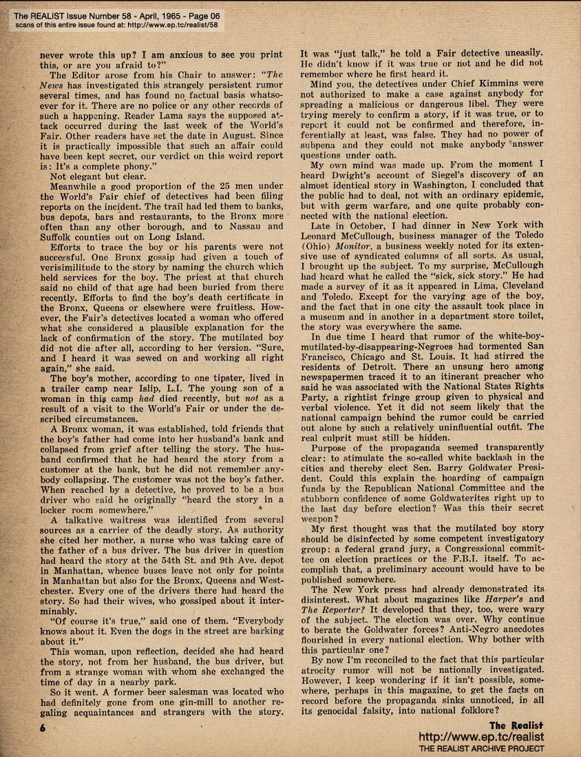 APRIL 1965 CONTENTS: Page 01: DICK GREGORY AND HIS MISSISSIPPI AIRLIFT - WOODY ALLEN AND HIS IMPOLITE INTERVIEW - and - STEVE ALLEN AND HIS CHINESE A-BOMB -- Page 02: EDITORIAL GIGGLES: The Truth Shall Make You Impotent - No Abortions Against This Wall -- Page 03: Signs Along the Cynic Route - The Free Speech Pill Smugglers - Riddle of the Month - Fink Foils Fascist Fomenting Fag Fest -- Page 04: The Height of Morality - Lenny Bruce is Alive, By the Way - and - AH SORDID ANNOUNCEMENTS -- Page 05: ANATOMY OF A RUMOR by Oliver Pilat -- Page 06 -- Page 07: SON OF TV'S FINEST HOUR by Tad Richards - and - The REALIST'S QUERY OF THE MONTH -- Page 08: BOB ABEL'S CRAP COLUMN: Malignant Humanitarianism Awards - Requiem for an Overrate - Cooz for Mr. Charlie -- Page 09: ED FISHER'S PAGE -- Page 10 -- Page 11 -- Page 12 -- Page 13 -- Page 14 -- Page 15 -- Page 16: THREE AUTHORS IN SEARCH OF OBSCENE LITERATURE (or–Lucky Carol, she's in the middle!) by Alfred Bolton, Carol Glaser, and John Francis Putnam -- Page 17: EXHIBIT A -- Page 18: SEND THIS BOY TO CAMP -- Page 19: AN EXPOSÉ BY A LITTLE OLD LADY as told to Stanley Koven -- Page 20 -- RUMOR OF THE MONTH -- Page 21 THE REALIST'S WOMEN'S PAGE: What's New In Fashion? - If the Procrustean Surgery Fits ... I dreamed I shot a nigger in my maidenform bra - and - FREE ENTERPRISE IN ACTION by Marcia Seligson and Janet Sorkin -- Page 22: STATISTICAL SUGGESTIONS -- Page 23 -- Page 24 -- Page 25 -- Page 26 -- Page 27 -- Page 28 -- Page 29: AN OPEN LETTER TO WILLAIM F. BUCKLEY, JR. -- Page 30 -- Page 31: The PARADOX OF RIGHTEOUSNESS -- BACK COVER: SOFT-CORE PORNOGRAPHY OF THE MONTH