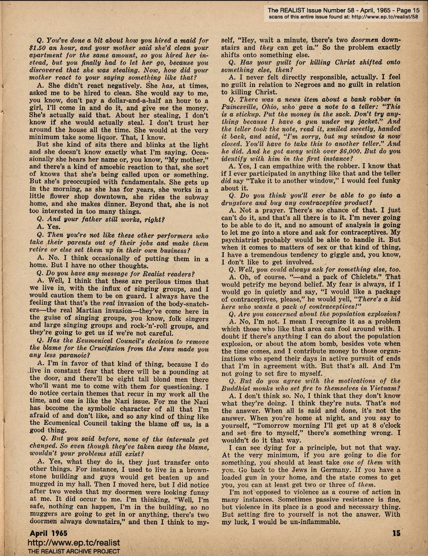 APRIL 1965 CONTENTS: Page 01: DICK GREGORY AND HIS MISSISSIPPI AIRLIFT - WOODY ALLEN AND HIS IMPOLITE INTERVIEW - and - STEVE ALLEN AND HIS CHINESE A-BOMB -- Page 02: EDITORIAL GIGGLES: The Truth Shall Make You Impotent - No Abortions Against This Wall -- Page 03: Signs Along the Cynic Route - The Free Speech Pill Smugglers - Riddle of the Month - Fink Foils Fascist Fomenting Fag Fest -- Page 04: The Height of Morality - Lenny Bruce is Alive, By the Way - and - AH SORDID ANNOUNCEMENTS -- Page 05: ANATOMY OF A RUMOR by Oliver Pilat -- Page 06 -- Page 07: SON OF TV'S FINEST HOUR by Tad Richards - and - The REALIST'S QUERY OF THE MONTH -- Page 08: BOB ABEL'S CRAP COLUMN: Malignant Humanitarianism Awards - Requiem for an Overrate - Cooz for Mr. Charlie -- Page 09: ED FISHER'S PAGE -- Page 10 -- Page 11 -- Page 12 -- Page 13 -- Page 14 -- Page 15 -- Page 16: THREE AUTHORS IN SEARCH OF OBSCENE LITERATURE (or–Lucky Carol, she's in the middle!) by Alfred Bolton, Carol Glaser, and John Francis Putnam -- Page 17: EXHIBIT A -- Page 18: SEND THIS BOY TO CAMP -- Page 19: AN EXPOSÉ BY A LITTLE OLD LADY as told to Stanley Koven -- Page 20 -- RUMOR OF THE MONTH -- Page 21 THE REALIST'S WOMEN'S PAGE: What's New In Fashion? - If the Procrustean Surgery Fits ... I dreamed I shot a nigger in my maidenform bra - and - FREE ENTERPRISE IN ACTION by Marcia Seligson and Janet Sorkin -- Page 22: STATISTICAL SUGGESTIONS -- Page 23 -- Page 24 -- Page 25 -- Page 26 -- Page 27 -- Page 28 -- Page 29: AN OPEN LETTER TO WILLAIM F. BUCKLEY, JR. -- Page 30 -- Page 31: The PARADOX OF RIGHTEOUSNESS -- BACK COVER: SOFT-CORE PORNOGRAPHY OF THE MONTH