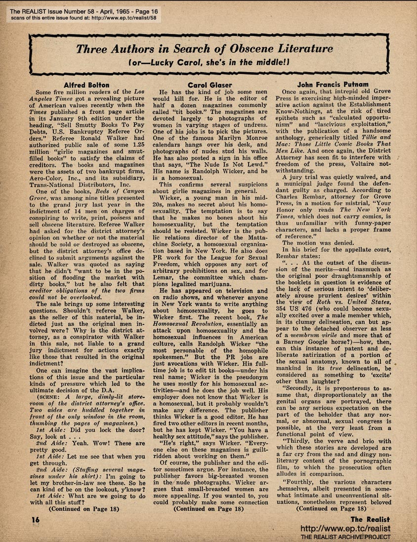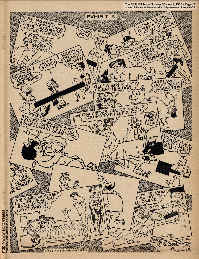APRIL 1965 CONTENTS: Page 01: DICK GREGORY AND HIS MISSISSIPPI AIRLIFT - WOODY ALLEN AND HIS IMPOLITE INTERVIEW - and - STEVE ALLEN AND HIS CHINESE A-BOMB -- Page 02: EDITORIAL GIGGLES: The Truth Shall Make You Impotent - No Abortions Against This Wall -- Page 03: Signs Along the Cynic Route - The Free Speech Pill Smugglers - Riddle of the Month - Fink Foils Fascist Fomenting Fag Fest -- Page 04: The Height of Morality - Lenny Bruce is Alive, By the Way - and - AH SORDID ANNOUNCEMENTS -- Page 05: ANATOMY OF A RUMOR by Oliver Pilat -- Page 06 -- Page 07: SON OF TV'S FINEST HOUR by Tad Richards - and - The REALIST'S QUERY OF THE MONTH -- Page 08: BOB ABEL'S CRAP COLUMN: Malignant Humanitarianism Awards - Requiem for an Overrate - Cooz for Mr. Charlie -- Page 09: ED FISHER'S PAGE -- Page 10 -- Page 11 -- Page 12 -- Page 13 -- Page 14 -- Page 15 -- Page 16: THREE AUTHORS IN SEARCH OF OBSCENE LITERATURE (or–Lucky Carol, she's in the middle!) by Alfred Bolton, Carol Glaser, and John Francis Putnam -- Page 17: EXHIBIT A -- Page 18: SEND THIS BOY TO CAMP -- Page 19: AN EXPOSÉ BY A LITTLE OLD LADY as told to Stanley Koven -- Page 20 -- RUMOR OF THE MONTH -- Page 21 THE REALIST'S WOMEN'S PAGE: What's New In Fashion? - If the Procrustean Surgery Fits ... I dreamed I shot a nigger in my maidenform bra - and - FREE ENTERPRISE IN ACTION by Marcia Seligson and Janet Sorkin -- Page 22: STATISTICAL SUGGESTIONS -- Page 23 -- Page 24 -- Page 25 -- Page 26 -- Page 27 -- Page 28 -- Page 29: AN OPEN LETTER TO WILLAIM F. BUCKLEY, JR. -- Page 30 -- Page 31: The PARADOX OF RIGHTEOUSNESS -- BACK COVER: SOFT-CORE PORNOGRAPHY OF THE MONTH
