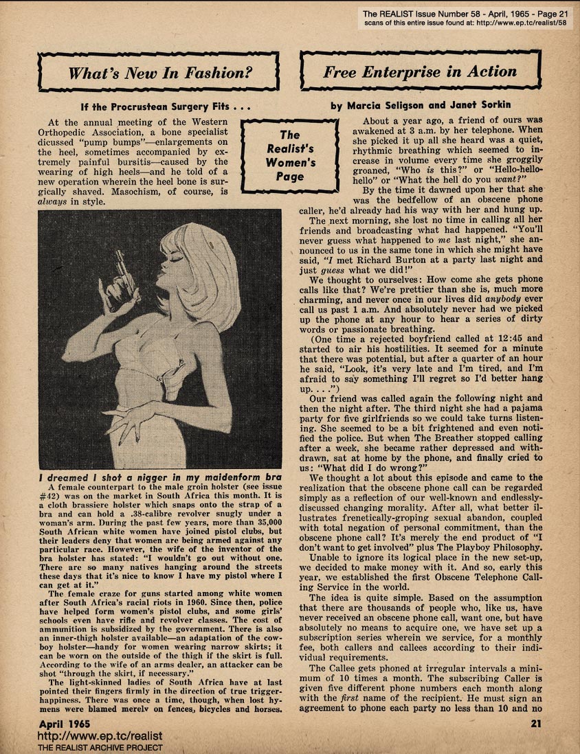 APRIL 1965 CONTENTS: Page 01: DICK GREGORY AND HIS MISSISSIPPI AIRLIFT - WOODY ALLEN AND HIS IMPOLITE INTERVIEW - and - STEVE ALLEN AND HIS CHINESE A-BOMB -- Page 02: EDITORIAL GIGGLES: The Truth Shall Make You Impotent - No Abortions Against This Wall -- Page 03: Signs Along the Cynic Route - The Free Speech Pill Smugglers - Riddle of the Month - Fink Foils Fascist Fomenting Fag Fest -- Page 04: The Height of Morality - Lenny Bruce is Alive, By the Way - and - AH SORDID ANNOUNCEMENTS -- Page 05: ANATOMY OF A RUMOR by Oliver Pilat -- Page 06 -- Page 07: SON OF TV'S FINEST HOUR by Tad Richards - and - The REALIST'S QUERY OF THE MONTH -- Page 08: BOB ABEL'S CRAP COLUMN: Malignant Humanitarianism Awards - Requiem for an Overrate - Cooz for Mr. Charlie -- Page 09: ED FISHER'S PAGE -- Page 10 -- Page 11 -- Page 12 -- Page 13 -- Page 14 -- Page 15 -- Page 16: THREE AUTHORS IN SEARCH OF OBSCENE LITERATURE (or–Lucky Carol, she's in the middle!) by Alfred Bolton, Carol Glaser, and John Francis Putnam -- Page 17: EXHIBIT A -- Page 18: SEND THIS BOY TO CAMP -- Page 19: AN EXPOSÉ BY A LITTLE OLD LADY as told to Stanley Koven -- Page 20 -- RUMOR OF THE MONTH -- Page 21 THE REALIST'S WOMEN'S PAGE: What's New In Fashion? - If the Procrustean Surgery Fits ... I dreamed I shot a nigger in my maidenform bra - and - FREE ENTERPRISE IN ACTION by Marcia Seligson and Janet Sorkin -- Page 22: STATISTICAL SUGGESTIONS -- Page 23 -- Page 24 -- Page 25 -- Page 26 -- Page 27 -- Page 28 -- Page 29: AN OPEN LETTER TO WILLAIM F. BUCKLEY, JR. -- Page 30 -- Page 31: The PARADOX OF RIGHTEOUSNESS -- BACK COVER: SOFT-CORE PORNOGRAPHY OF THE MONTH