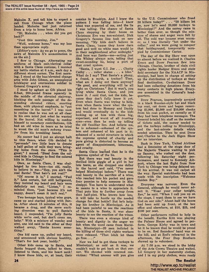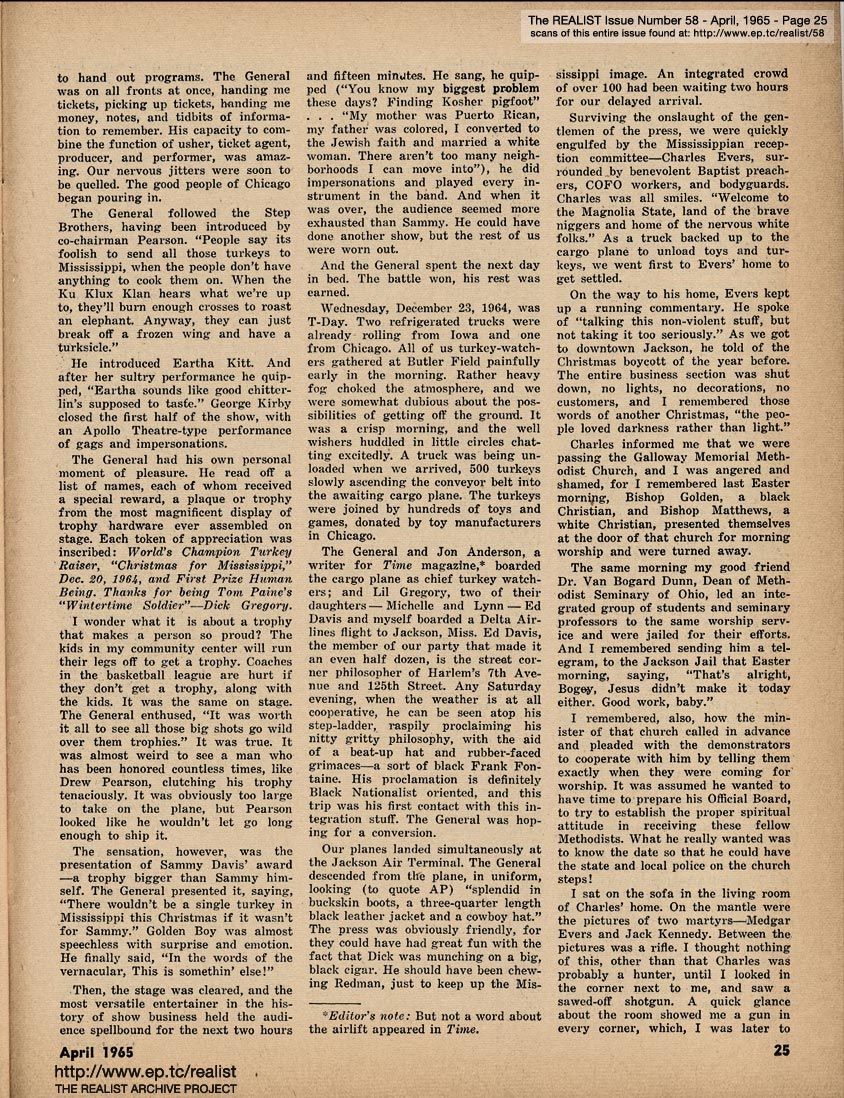 APRIL 1965 CONTENTS: Page 01: DICK GREGORY AND HIS MISSISSIPPI AIRLIFT - WOODY ALLEN AND HIS IMPOLITE INTERVIEW - and - STEVE ALLEN AND HIS CHINESE A-BOMB -- Page 02: EDITORIAL GIGGLES: The Truth Shall Make You Impotent - No Abortions Against This Wall -- Page 03: Signs Along the Cynic Route - The Free Speech Pill Smugglers - Riddle of the Month - Fink Foils Fascist Fomenting Fag Fest -- Page 04: The Height of Morality - Lenny Bruce is Alive, By the Way - and - AH SORDID ANNOUNCEMENTS -- Page 05: ANATOMY OF A RUMOR by Oliver Pilat -- Page 06 -- Page 07: SON OF TV'S FINEST HOUR by Tad Richards - and - The REALIST'S QUERY OF THE MONTH -- Page 08: BOB ABEL'S CRAP COLUMN: Malignant Humanitarianism Awards - Requiem for an Overrate - Cooz for Mr. Charlie -- Page 09: ED FISHER'S PAGE -- Page 10 -- Page 11 -- Page 12 -- Page 13 -- Page 14 -- Page 15 -- Page 16: THREE AUTHORS IN SEARCH OF OBSCENE LITERATURE (or–Lucky Carol, she's in the middle!) by Alfred Bolton, Carol Glaser, and John Francis Putnam -- Page 17: EXHIBIT A -- Page 18: SEND THIS BOY TO CAMP -- Page 19: AN EXPOSÉ BY A LITTLE OLD LADY as told to Stanley Koven -- Page 20 -- RUMOR OF THE MONTH -- Page 21 THE REALIST'S WOMEN'S PAGE: What's New In Fashion? - If the Procrustean Surgery Fits ... I dreamed I shot a nigger in my maidenform bra - and - FREE ENTERPRISE IN ACTION by Marcia Seligson and Janet Sorkin -- Page 22: STATISTICAL SUGGESTIONS -- Page 23 -- Page 24 -- Page 25 -- Page 26 -- Page 27 -- Page 28 -- Page 29: AN OPEN LETTER TO WILLAIM F. BUCKLEY, JR. -- Page 30 -- Page 31: The PARADOX OF RIGHTEOUSNESS -- BACK COVER: SOFT-CORE PORNOGRAPHY OF THE MONTH
