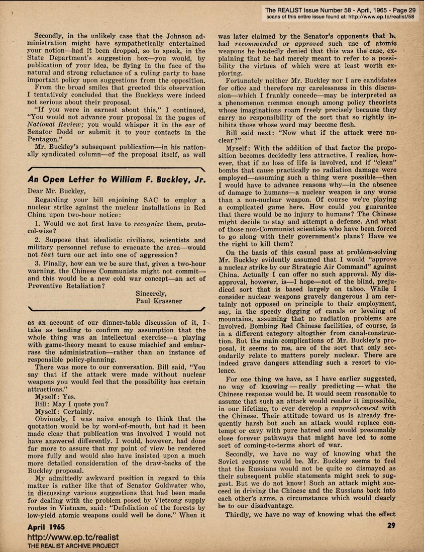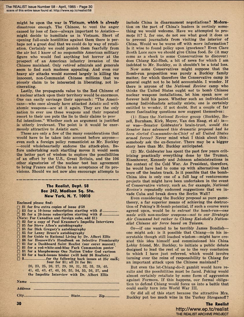 APRIL 1965 CONTENTS: Page 01: DICK GREGORY AND HIS MISSISSIPPI AIRLIFT - WOODY ALLEN AND HIS IMPOLITE INTERVIEW - and - STEVE ALLEN AND HIS CHINESE A-BOMB -- Page 02: EDITORIAL GIGGLES: The Truth Shall Make You Impotent - No Abortions Against This Wall -- Page 03: Signs Along the Cynic Route - The Free Speech Pill Smugglers - Riddle of the Month - Fink Foils Fascist Fomenting Fag Fest -- Page 04: The Height of Morality - Lenny Bruce is Alive, By the Way - and - AH SORDID ANNOUNCEMENTS -- Page 05: ANATOMY OF A RUMOR by Oliver Pilat -- Page 06 -- Page 07: SON OF TV'S FINEST HOUR by Tad Richards - and - The REALIST'S QUERY OF THE MONTH -- Page 08: BOB ABEL'S CRAP COLUMN: Malignant Humanitarianism Awards - Requiem for an Overrate - Cooz for Mr. Charlie -- Page 09: ED FISHER'S PAGE -- Page 10 -- Page 11 -- Page 12 -- Page 13 -- Page 14 -- Page 15 -- Page 16: THREE AUTHORS IN SEARCH OF OBSCENE LITERATURE (or–Lucky Carol, she's in the middle!) by Alfred Bolton, Carol Glaser, and John Francis Putnam -- Page 17: EXHIBIT A -- Page 18: SEND THIS BOY TO CAMP -- Page 19: AN EXPOSÉ BY A LITTLE OLD LADY as told to Stanley Koven -- Page 20 -- RUMOR OF THE MONTH -- Page 21 THE REALIST'S WOMEN'S PAGE: What's New In Fashion? - If the Procrustean Surgery Fits ... I dreamed I shot a nigger in my maidenform bra - and - FREE ENTERPRISE IN ACTION by Marcia Seligson and Janet Sorkin -- Page 22: STATISTICAL SUGGESTIONS -- Page 23 -- Page 24 -- Page 25 -- Page 26 -- Page 27 -- Page 28 -- Page 29: AN OPEN LETTER TO WILLAIM F. BUCKLEY, JR. -- Page 30 -- Page 31: The PARADOX OF RIGHTEOUSNESS -- BACK COVER: SOFT-CORE PORNOGRAPHY OF THE MONTH