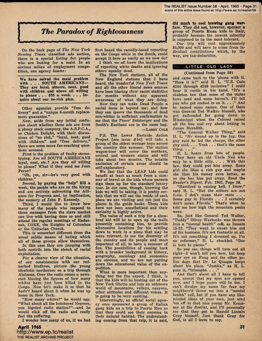 APRIL 1965 CONTENTS: Page 01: DICK GREGORY AND HIS MISSISSIPPI AIRLIFT - WOODY ALLEN AND HIS IMPOLITE INTERVIEW - and - STEVE ALLEN AND HIS CHINESE A-BOMB -- Page 02: EDITORIAL GIGGLES: The Truth Shall Make You Impotent - No Abortions Against This Wall -- Page 03: Signs Along the Cynic Route - The Free Speech Pill Smugglers - Riddle of the Month - Fink Foils Fascist Fomenting Fag Fest -- Page 04: The Height of Morality - Lenny Bruce is Alive, By the Way - and - AH SORDID ANNOUNCEMENTS -- Page 05: ANATOMY OF A RUMOR by Oliver Pilat -- Page 06 -- Page 07: SON OF TV'S FINEST HOUR by Tad Richards - and - The REALIST'S QUERY OF THE MONTH -- Page 08: BOB ABEL'S CRAP COLUMN: Malignant Humanitarianism Awards - Requiem for an Overrate - Cooz for Mr. Charlie -- Page 09: ED FISHER'S PAGE -- Page 10 -- Page 11 -- Page 12 -- Page 13 -- Page 14 -- Page 15 -- Page 16: THREE AUTHORS IN SEARCH OF OBSCENE LITERATURE (or–Lucky Carol, she's in the middle!) by Alfred Bolton, Carol Glaser, and John Francis Putnam -- Page 17: EXHIBIT A -- Page 18: SEND THIS BOY TO CAMP -- Page 19: AN EXPOSÉ BY A LITTLE OLD LADY as told to Stanley Koven -- Page 20 -- RUMOR OF THE MONTH -- Page 21 THE REALIST'S WOMEN'S PAGE: What's New In Fashion? - If the Procrustean Surgery Fits ... I dreamed I shot a nigger in my maidenform bra - and - FREE ENTERPRISE IN ACTION by Marcia Seligson and Janet Sorkin -- Page 22: STATISTICAL SUGGESTIONS -- Page 23 -- Page 24 -- Page 25 -- Page 26 -- Page 27 -- Page 28 -- Page 29: AN OPEN LETTER TO WILLAIM F. BUCKLEY, JR. -- Page 30 -- Page 31: The PARADOX OF RIGHTEOUSNESS -- BACK COVER: SOFT-CORE PORNOGRAPHY OF THE MONTH