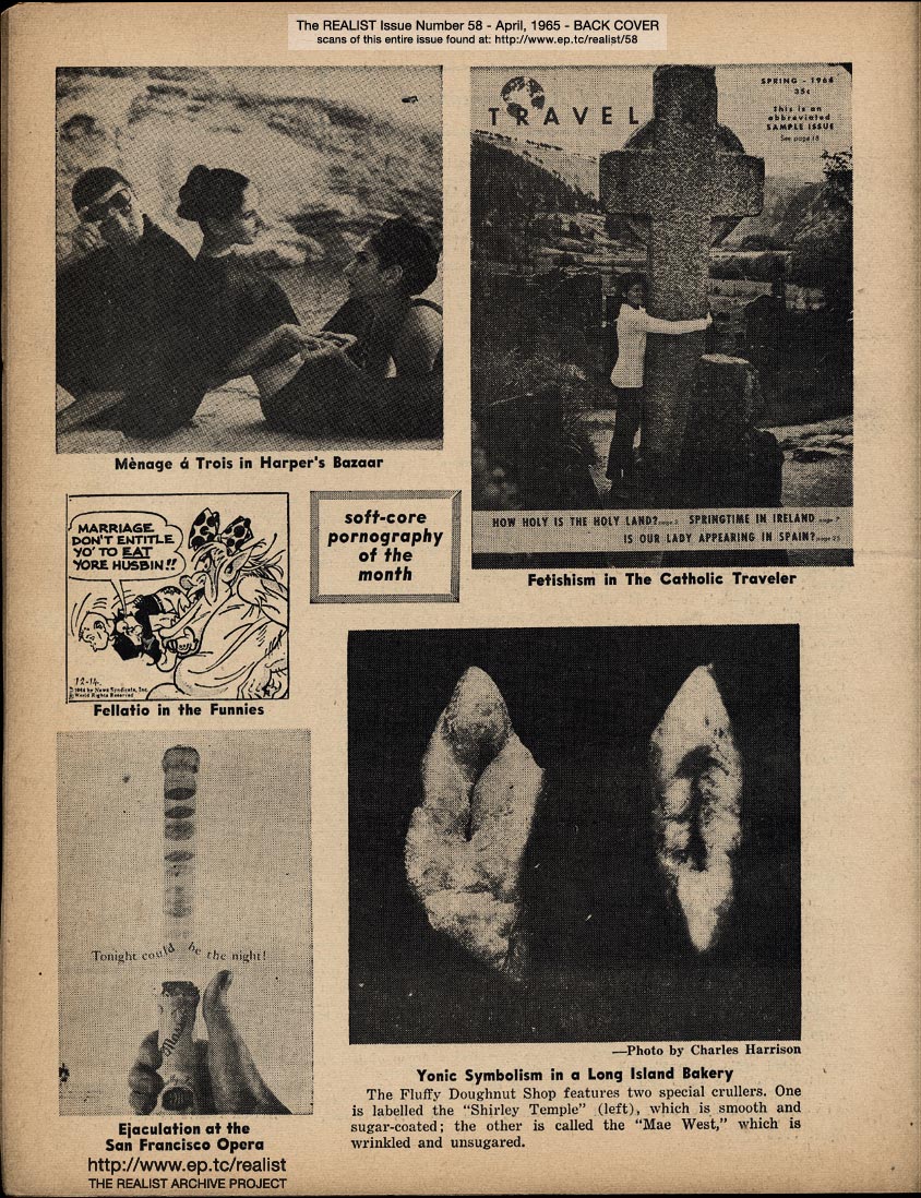 APRIL 1965 CONTENTS: Page 01: DICK GREGORY AND HIS MISSISSIPPI AIRLIFT - WOODY ALLEN AND HIS IMPOLITE INTERVIEW - and - STEVE ALLEN AND HIS CHINESE A-BOMB -- Page 02: EDITORIAL GIGGLES: The Truth Shall Make You Impotent - No Abortions Against This Wall -- Page 03: Signs Along the Cynic Route - The Free Speech Pill Smugglers - Riddle of the Month - Fink Foils Fascist Fomenting Fag Fest -- Page 04: The Height of Morality - Lenny Bruce is Alive, By the Way - and - AH SORDID ANNOUNCEMENTS -- Page 05: ANATOMY OF A RUMOR by Oliver Pilat -- Page 06 -- Page 07: SON OF TV'S FINEST HOUR by Tad Richards - and - The REALIST'S QUERY OF THE MONTH -- Page 08: BOB ABEL'S CRAP COLUMN: Malignant Humanitarianism Awards - Requiem for an Overrate - Cooz for Mr. Charlie -- Page 09: ED FISHER'S PAGE -- Page 10 -- Page 11 -- Page 12 -- Page 13 -- Page 14 -- Page 15 -- Page 16: THREE AUTHORS IN SEARCH OF OBSCENE LITERATURE (or–Lucky Carol, she's in the middle!) by Alfred Bolton, Carol Glaser, and John Francis Putnam -- Page 17: EXHIBIT A -- Page 18: SEND THIS BOY TO CAMP -- Page 19: AN EXPOSÉ BY A LITTLE OLD LADY as told to Stanley Koven -- Page 20 -- RUMOR OF THE MONTH -- Page 21 THE REALIST'S WOMEN'S PAGE: What's New In Fashion? - If the Procrustean Surgery Fits ... I dreamed I shot a nigger in my maidenform bra - and - FREE ENTERPRISE IN ACTION by Marcia Seligson and Janet Sorkin -- Page 22: STATISTICAL SUGGESTIONS -- Page 23 -- Page 24 -- Page 25 -- Page 26 -- Page 27 -- Page 28 -- Page 29: AN OPEN LETTER TO WILLAIM F. BUCKLEY, JR. -- Page 30 -- Page 31: The PARADOX OF RIGHTEOUSNESS -- BACK COVER: SOFT-CORE PORNOGRAPHY OF THE MONTH