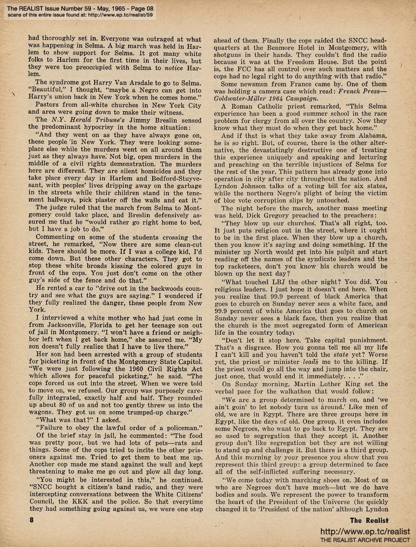 MAY 1965 CONTENTS: Page 01: COMIC BOOK ESCALATION OF AMERICA'S WAR ON VIETNAM and YOU DON'T HAVE TO BE JEWISH TO LOVE LEROI JONES -- Page 02: An Exegetical Study of the New Tom the Word Wolfe's STYL by Barbara Long -- Page 03: EDITORIAL GIGGIES -- Page 04: NO, VIRGINIA by Alan Whitney -- Page 05: FOOTNOTES OF A MARCHER by Rev. James R. McGraw -- Page 06 -- Page 07 -- Page 08 -- Page 09: A LETTER FROM JOSEPH HELLER -- Page 10 -- Page 11: "We Don't Want to Marry Your Sister" by Bill Murphy -- Page 12: CO-EXISTING by Saul Heller -- Page 13 -- Page 14 -- Page 15: CROTTES DE LICORNE by Harold Feldman -- Page 16: The ADVENTURES of SUPERIORMAN! by Bloom/Leonard -- Page 17 -- Page 18 -- Page 19 -- Page 20: ED FISHER'S (HALF) PAGE -- Page 21: SIR REALIST (letters) -- Page 22 -- Page 23 -- Page 24 -- Page 25: PRESS DISTORTION OF THE FREE SPEECH MOVEMENT by Michael Nagler and by Floyd Hunter -- Page 26 -- Page 27 -- Page 28: WHY I DID IT - or, Happiness is a 4-letter word by John J. Thomson -- Page 29: ONCE AGAIN THE REALIST PRESENTS BOTH SIDES OF A QUESTION by Larry Cole: Altruistic Function and Effectiveness or -- How to Be a Good Guy and by John Francis Putnam: Managerial Function and Effectiveness or -- How to Be a Prick -- Page 30 -- Page 31 -- Back Cover: MALICE IN WONDERLAND by Madalyn E. Murray and DRAFTLESS IN UTOPIA by Robert Wolf