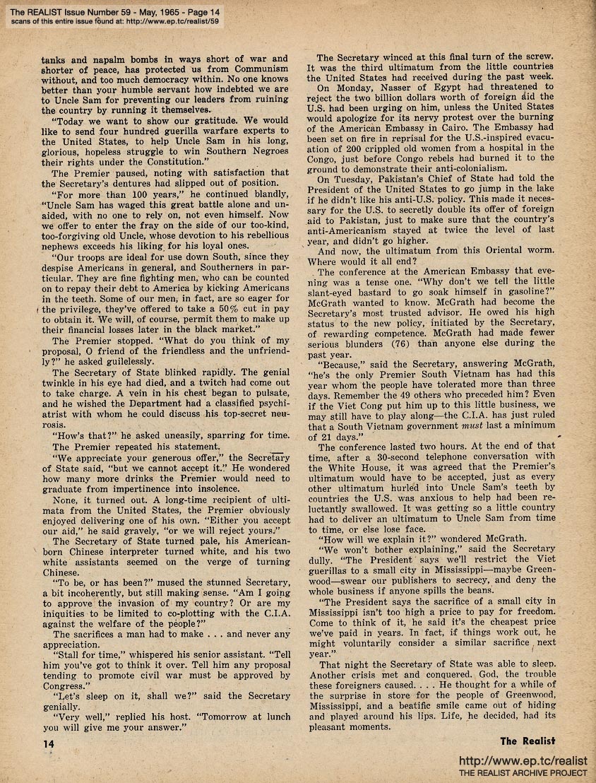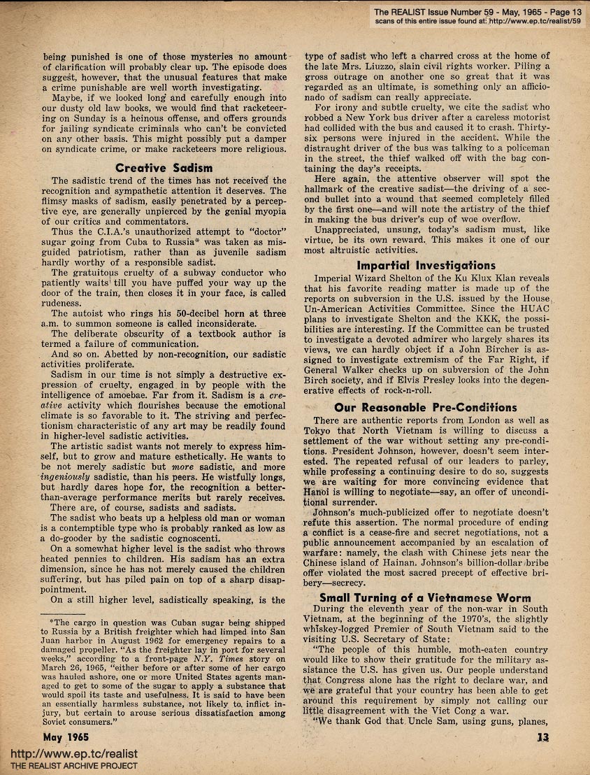 MAY 1965 CONTENTS: Page 01: COMIC BOOK ESCALATION OF AMERICA'S WAR ON VIETNAM and YOU DON'T HAVE TO BE JEWISH TO LOVE LEROI JONES -- Page 02: An Exegetical Study of the New Tom the Word Wolfe's STYL by Barbara Long -- Page 03: EDITORIAL GIGGIES -- Page 04: NO, VIRGINIA by Alan Whitney -- Page 05: FOOTNOTES OF A MARCHER by Rev. James R. McGraw -- Page 06 -- Page 07 -- Page 08 -- Page 09: A LETTER FROM JOSEPH HELLER -- Page 10 -- Page 11: "We Don't Want to Marry Your Sister" by Bill Murphy -- Page 12: CO-EXISTING by Saul Heller -- Page 13 -- Page 14 -- Page 15: CROTTES DE LICORNE by Harold Feldman -- Page 16: The ADVENTURES of SUPERIORMAN! by Bloom/Leonard -- Page 17 -- Page 18 -- Page 19 -- Page 20: ED FISHER'S (HALF) PAGE -- Page 21: SIR REALIST (letters) -- Page 22 -- Page 23 -- Page 24 -- Page 25: PRESS DISTORTION OF THE FREE SPEECH MOVEMENT by Michael Nagler and by Floyd Hunter -- Page 26 -- Page 27 -- Page 28: WHY I DID IT - or, Happiness is a 4-letter word by John J. Thomson -- Page 29: ONCE AGAIN THE REALIST PRESENTS BOTH SIDES OF A QUESTION by Larry Cole: Altruistic Function and Effectiveness or -- How to Be a Good Guy and by John Francis Putnam: Managerial Function and Effectiveness or -- How to Be a Prick -- Page 30 -- Page 31 -- Back Cover: MALICE IN WONDERLAND by Madalyn E. Murray and DRAFTLESS IN UTOPIA by Robert Wolf
