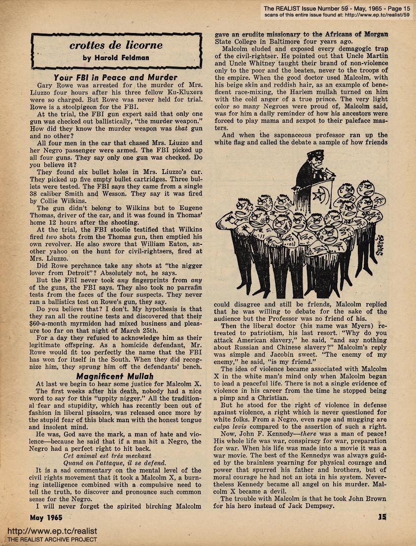 MAY 1965 CONTENTS: Page 01: COMIC BOOK ESCALATION OF AMERICA'S WAR ON VIETNAM and YOU DON'T HAVE TO BE JEWISH TO LOVE LEROI JONES -- Page 02: An Exegetical Study of the New Tom the Word Wolfe's STYL by Barbara Long -- Page 03: EDITORIAL GIGGIES -- Page 04: NO, VIRGINIA by Alan Whitney -- Page 05: FOOTNOTES OF A MARCHER by Rev. James R. McGraw -- Page 06 -- Page 07 -- Page 08 -- Page 09: A LETTER FROM JOSEPH HELLER -- Page 10 -- Page 11: "We Don't Want to Marry Your Sister" by Bill Murphy -- Page 12: CO-EXISTING by Saul Heller -- Page 13 -- Page 14 -- Page 15: CROTTES DE LICORNE by Harold Feldman -- Page 16: The ADVENTURES of SUPERIORMAN! by Bloom/Leonard -- Page 17 -- Page 18 -- Page 19 -- Page 20: ED FISHER'S (HALF) PAGE -- Page 21: SIR REALIST (letters) -- Page 22 -- Page 23 -- Page 24 -- Page 25: PRESS DISTORTION OF THE FREE SPEECH MOVEMENT by Michael Nagler and by Floyd Hunter -- Page 26 -- Page 27 -- Page 28: WHY I DID IT - or, Happiness is a 4-letter word by John J. Thomson -- Page 29: ONCE AGAIN THE REALIST PRESENTS BOTH SIDES OF A QUESTION by Larry Cole: Altruistic Function and Effectiveness or -- How to Be a Good Guy and by John Francis Putnam: Managerial Function and Effectiveness or -- How to Be a Prick -- Page 30 -- Page 31 -- Back Cover: MALICE IN WONDERLAND by Madalyn E. Murray and DRAFTLESS IN UTOPIA by Robert Wolf