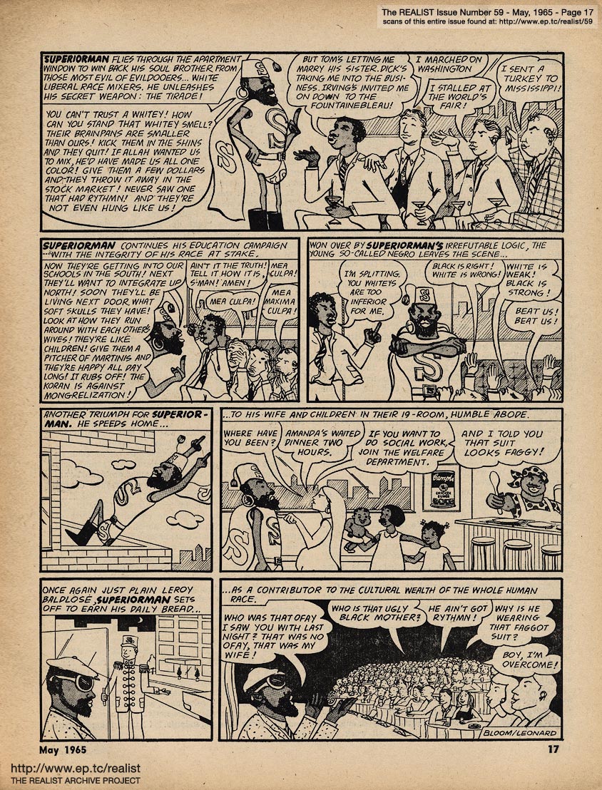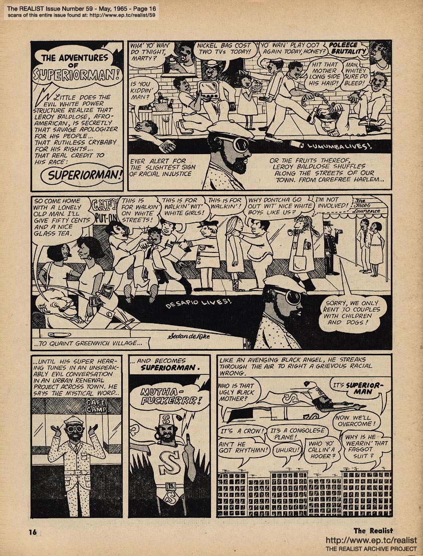 MAY 1965 CONTENTS: Page 01: COMIC BOOK ESCALATION OF AMERICA'S WAR ON VIETNAM and YOU DON'T HAVE TO BE JEWISH TO LOVE LEROI JONES -- Page 02: An Exegetical Study of the New Tom the Word Wolfe's STYL by Barbara Long -- Page 03: EDITORIAL GIGGIES -- Page 04: NO, VIRGINIA by Alan Whitney -- Page 05: FOOTNOTES OF A MARCHER by Rev. James R. McGraw -- Page 06 -- Page 07 -- Page 08 -- Page 09: A LETTER FROM JOSEPH HELLER -- Page 10 -- Page 11: "We Don't Want to Marry Your Sister" by Bill Murphy -- Page 12: CO-EXISTING by Saul Heller -- Page 13 -- Page 14 -- Page 15: CROTTES DE LICORNE by Harold Feldman -- Page 16: The ADVENTURES of SUPERIORMAN! by Bloom/Leonard -- Page 17 -- Page 18 -- Page 19 -- Page 20: ED FISHER'S (HALF) PAGE -- Page 21: SIR REALIST (letters) -- Page 22 -- Page 23 -- Page 24 -- Page 25: PRESS DISTORTION OF THE FREE SPEECH MOVEMENT by Michael Nagler and by Floyd Hunter -- Page 26 -- Page 27 -- Page 28: WHY I DID IT - or, Happiness is a 4-letter word by John J. Thomson -- Page 29: ONCE AGAIN THE REALIST PRESENTS BOTH SIDES OF A QUESTION by Larry Cole: Altruistic Function and Effectiveness or -- How to Be a Good Guy and by John Francis Putnam: Managerial Function and Effectiveness or -- How to Be a Prick -- Page 30 -- Page 31 -- Back Cover: MALICE IN WONDERLAND by Madalyn E. Murray and DRAFTLESS IN UTOPIA by Robert Wolf