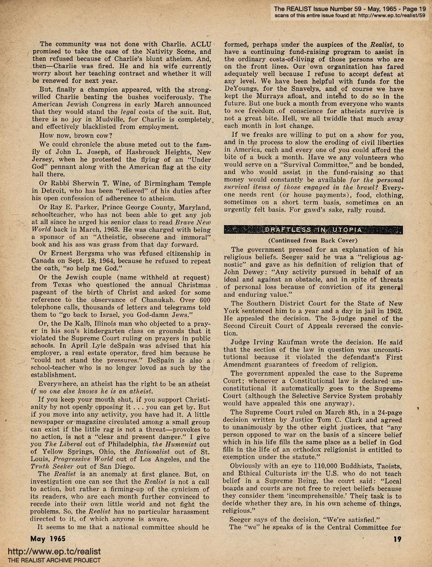 MAY 1965 CONTENTS: Page 01: COMIC BOOK ESCALATION OF AMERICA'S WAR ON VIETNAM and YOU DON'T HAVE TO BE JEWISH TO LOVE LEROI JONES -- Page 02: An Exegetical Study of the New Tom the Word Wolfe's STYL by Barbara Long -- Page 03: EDITORIAL GIGGIES -- Page 04: NO, VIRGINIA by Alan Whitney -- Page 05: FOOTNOTES OF A MARCHER by Rev. James R. McGraw -- Page 06 -- Page 07 -- Page 08 -- Page 09: A LETTER FROM JOSEPH HELLER -- Page 10 -- Page 11: "We Don't Want to Marry Your Sister" by Bill Murphy -- Page 12: CO-EXISTING by Saul Heller -- Page 13 -- Page 14 -- Page 15: CROTTES DE LICORNE by Harold Feldman -- Page 16: The ADVENTURES of SUPERIORMAN! by Bloom/Leonard -- Page 17 -- Page 18 -- Page 19 -- Page 20: ED FISHER'S (HALF) PAGE -- Page 21: SIR REALIST (letters) -- Page 22 -- Page 23 -- Page 24 -- Page 25: PRESS DISTORTION OF THE FREE SPEECH MOVEMENT by Michael Nagler and by Floyd Hunter -- Page 26 -- Page 27 -- Page 28: WHY I DID IT - or, Happiness is a 4-letter word by John J. Thomson -- Page 29: ONCE AGAIN THE REALIST PRESENTS BOTH SIDES OF A QUESTION by Larry Cole: Altruistic Function and Effectiveness or -- How to Be a Good Guy and by John Francis Putnam: Managerial Function and Effectiveness or -- How to Be a Prick -- Page 30 -- Page 31 -- Back Cover: MALICE IN WONDERLAND by Madalyn E. Murray and DRAFTLESS IN UTOPIA by Robert Wolf