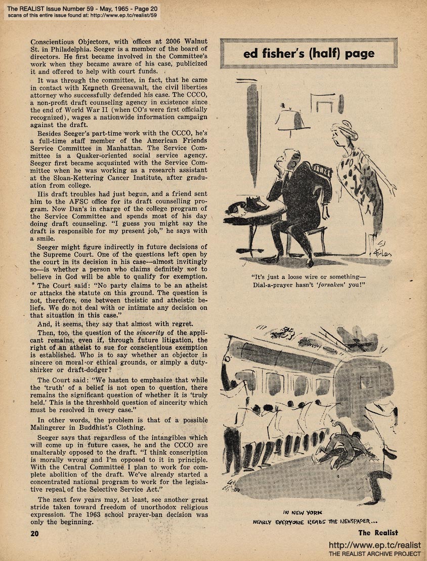 MAY 1965 CONTENTS: Page 01: COMIC BOOK ESCALATION OF AMERICA'S WAR ON VIETNAM and YOU DON'T HAVE TO BE JEWISH TO LOVE LEROI JONES -- Page 02: An Exegetical Study of the New Tom the Word Wolfe's STYL by Barbara Long -- Page 03: EDITORIAL GIGGIES -- Page 04: NO, VIRGINIA by Alan Whitney -- Page 05: FOOTNOTES OF A MARCHER by Rev. James R. McGraw -- Page 06 -- Page 07 -- Page 08 -- Page 09: A LETTER FROM JOSEPH HELLER -- Page 10 -- Page 11: "We Don't Want to Marry Your Sister" by Bill Murphy -- Page 12: CO-EXISTING by Saul Heller -- Page 13 -- Page 14 -- Page 15: CROTTES DE LICORNE by Harold Feldman -- Page 16: The ADVENTURES of SUPERIORMAN! by Bloom/Leonard -- Page 17 -- Page 18 -- Page 19 -- Page 20: ED FISHER'S (HALF) PAGE -- Page 21: SIR REALIST (letters) -- Page 22 -- Page 23 -- Page 24 -- Page 25: PRESS DISTORTION OF THE FREE SPEECH MOVEMENT by Michael Nagler and by Floyd Hunter -- Page 26 -- Page 27 -- Page 28: WHY I DID IT - or, Happiness is a 4-letter word by John J. Thomson -- Page 29: ONCE AGAIN THE REALIST PRESENTS BOTH SIDES OF A QUESTION by Larry Cole: Altruistic Function and Effectiveness or -- How to Be a Good Guy and by John Francis Putnam: Managerial Function and Effectiveness or -- How to Be a Prick -- Page 30 -- Page 31 -- Back Cover: MALICE IN WONDERLAND by Madalyn E. Murray and DRAFTLESS IN UTOPIA by Robert Wolf