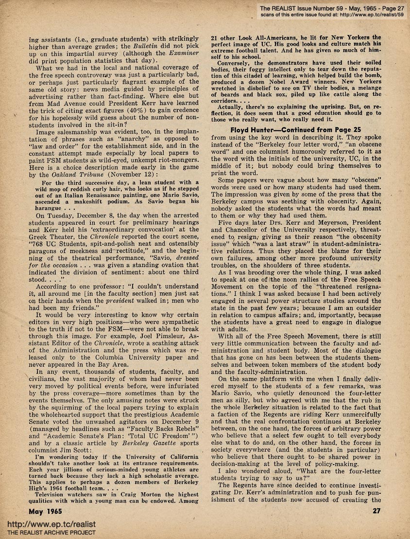 MAY 1965 CONTENTS: Page 01: COMIC BOOK ESCALATION OF AMERICA'S WAR ON VIETNAM and YOU DON'T HAVE TO BE JEWISH TO LOVE LEROI JONES -- Page 02: An Exegetical Study of the New Tom the Word Wolfe's STYL by Barbara Long -- Page 03: EDITORIAL GIGGIES -- Page 04: NO, VIRGINIA by Alan Whitney -- Page 05: FOOTNOTES OF A MARCHER by Rev. James R. McGraw -- Page 06 -- Page 07 -- Page 08 -- Page 09: A LETTER FROM JOSEPH HELLER -- Page 10 -- Page 11: "We Don't Want to Marry Your Sister" by Bill Murphy -- Page 12: CO-EXISTING by Saul Heller -- Page 13 -- Page 14 -- Page 15: CROTTES DE LICORNE by Harold Feldman -- Page 16: The ADVENTURES of SUPERIORMAN! by Bloom/Leonard -- Page 17 -- Page 18 -- Page 19 -- Page 20: ED FISHER'S (HALF) PAGE -- Page 21: SIR REALIST (letters) -- Page 22 -- Page 23 -- Page 24 -- Page 25: PRESS DISTORTION OF THE FREE SPEECH MOVEMENT by Michael Nagler and by Floyd Hunter -- Page 26 -- Page 27 -- Page 28: WHY I DID IT - or, Happiness is a 4-letter word by John J. Thomson -- Page 29: ONCE AGAIN THE REALIST PRESENTS BOTH SIDES OF A QUESTION by Larry Cole: Altruistic Function and Effectiveness or -- How to Be a Good Guy and by John Francis Putnam: Managerial Function and Effectiveness or -- How to Be a Prick -- Page 30 -- Page 31 -- Back Cover: MALICE IN WONDERLAND by Madalyn E. Murray and DRAFTLESS IN UTOPIA by Robert Wolf